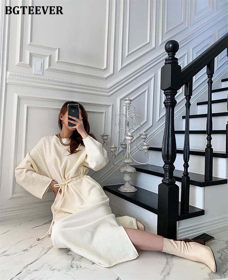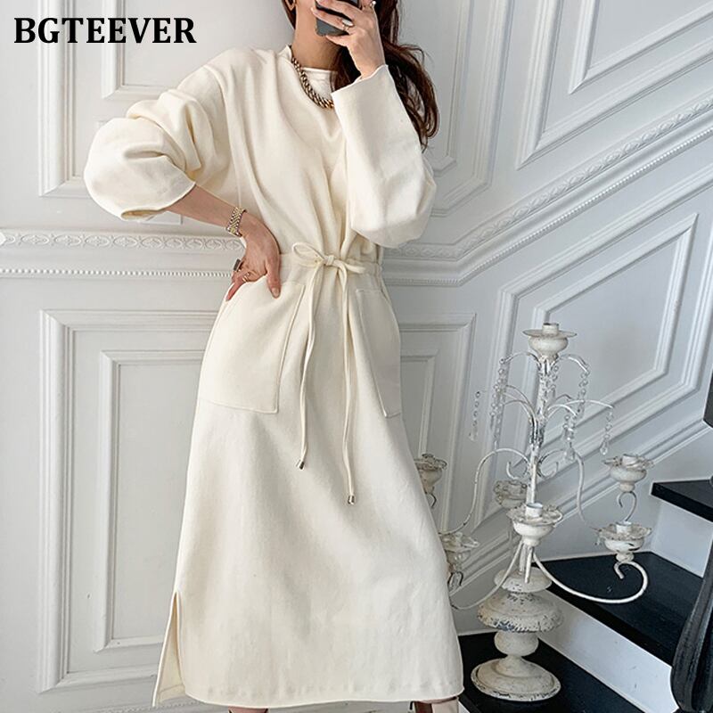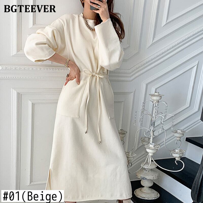 【新作】【送料無料】 BGTEEVERレディースOネック長袖ミドル丈ドレスルーズレースアップポケットドレススプリングサイドスプリットソリッドVestidos ロング 春物 ソリッドカラー 12b156590161359