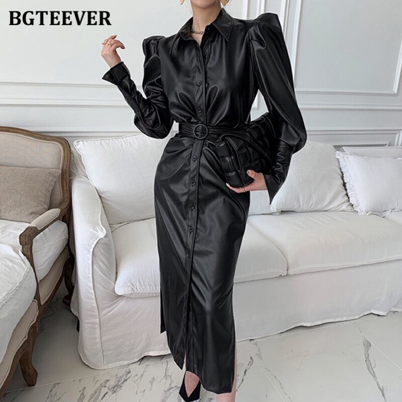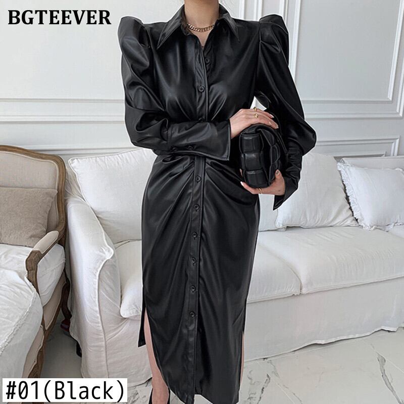 【新作】【送料無料】 BGTEEVERレディースターンダウンカラーPUレザーパッケージヒップドレススタイリッシュなパフスリーブベルト付きスリムペンシル ハーネス 12b199942271917