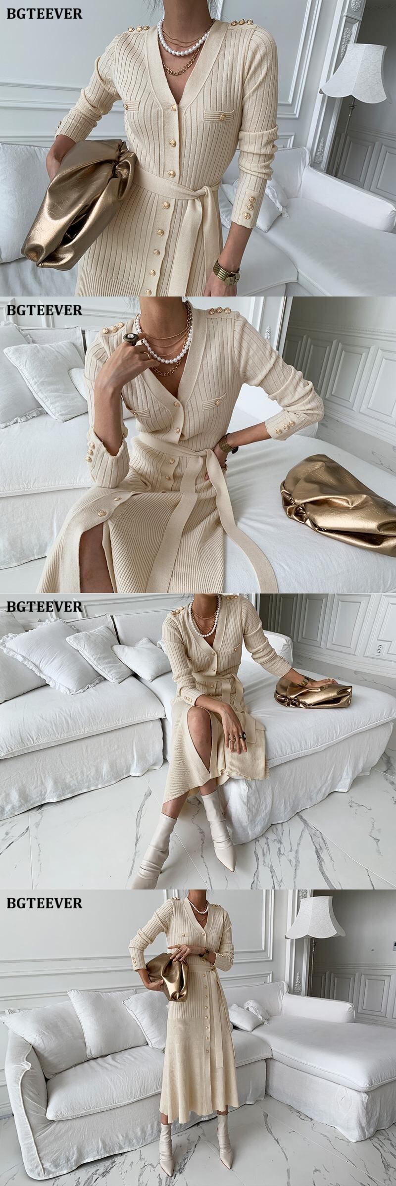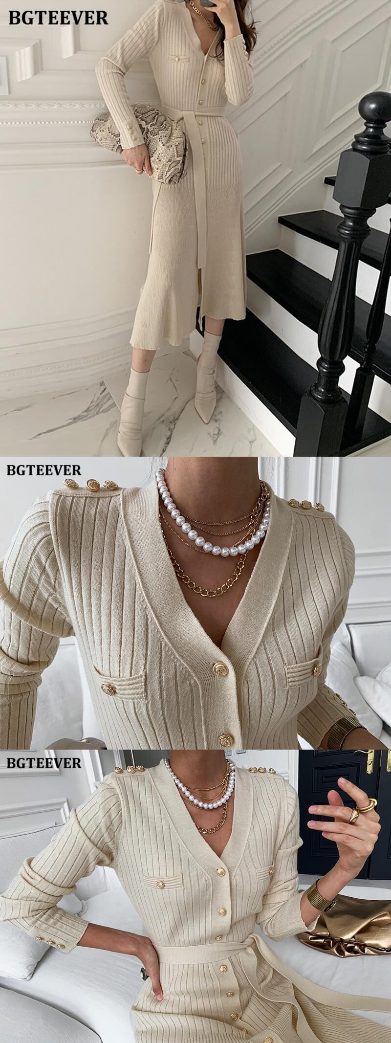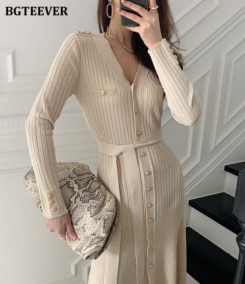 【新作】【送料無料】 BGTEEVERシックなフルスリーブロングニットボディコンドレス女性2021VネックシングルブレストレースアップスリムセーターVestidos 12b156387421585