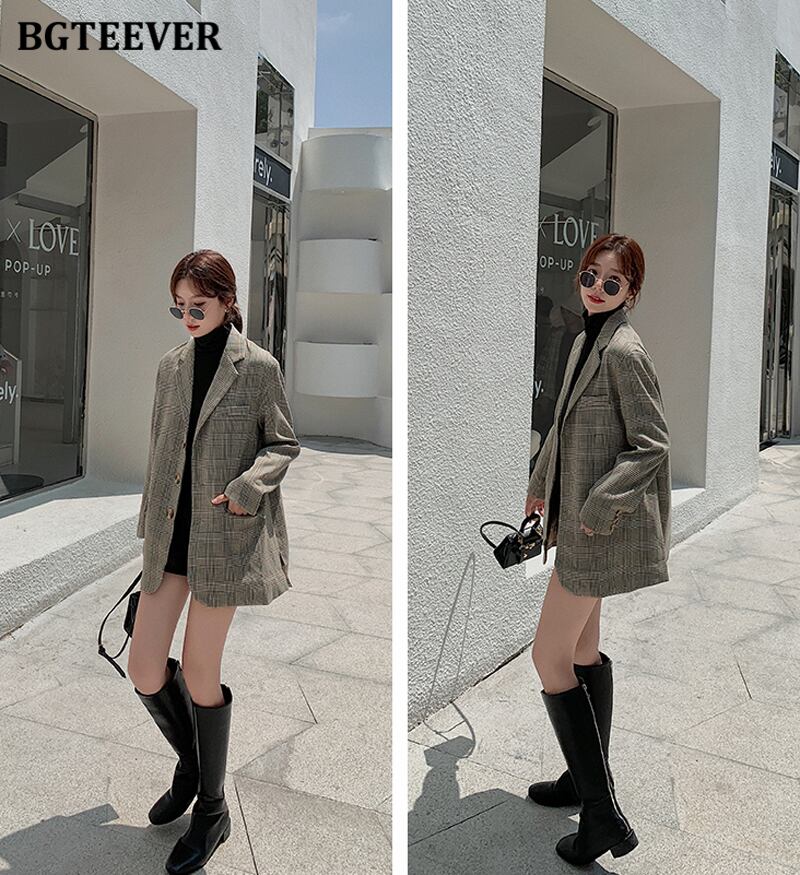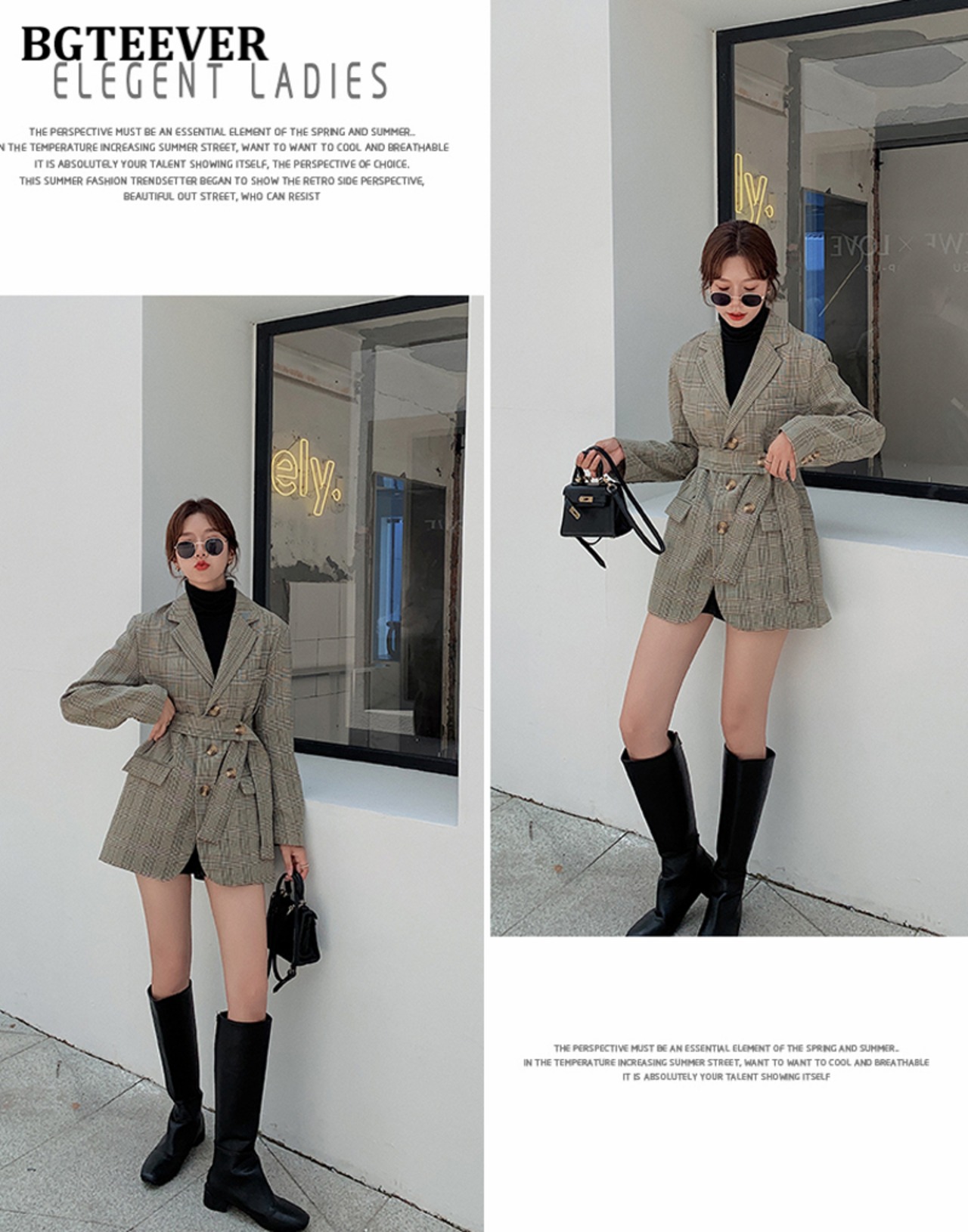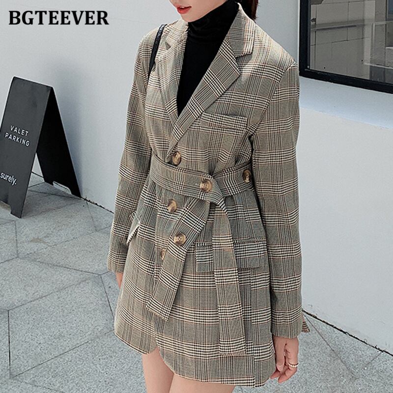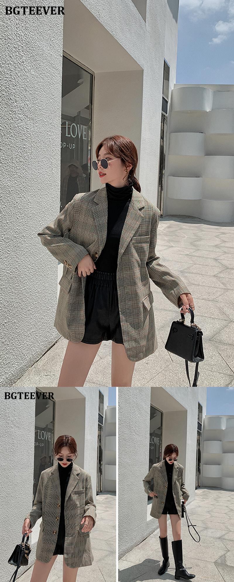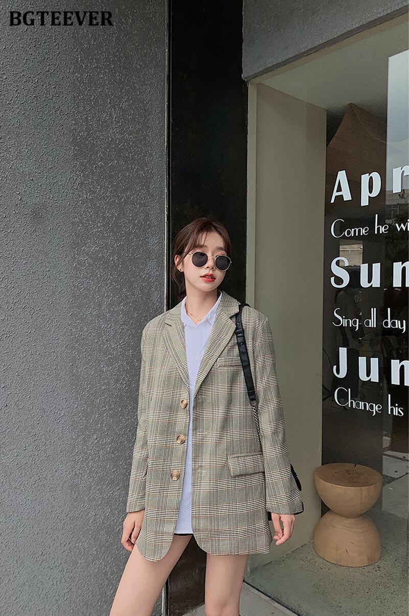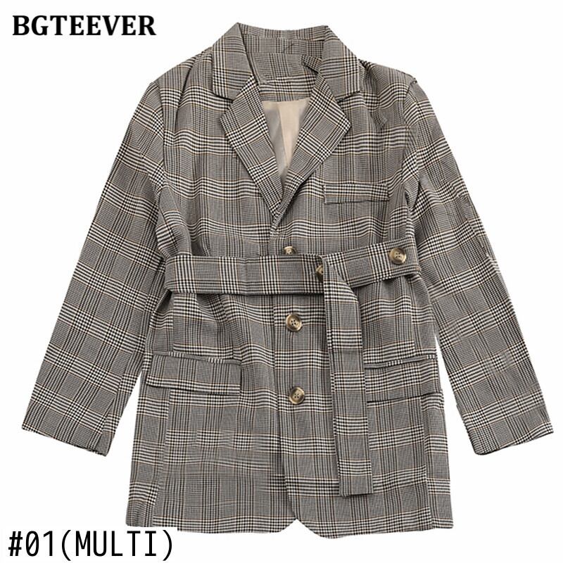 【新作】【送料無料】 BGTEEVER春シングルブレスト女性格子縞ブレザージャケットノッチカラールーズベルトスーツジャケット2021アウター スプリング 春物 ハーネス 12b116688676086