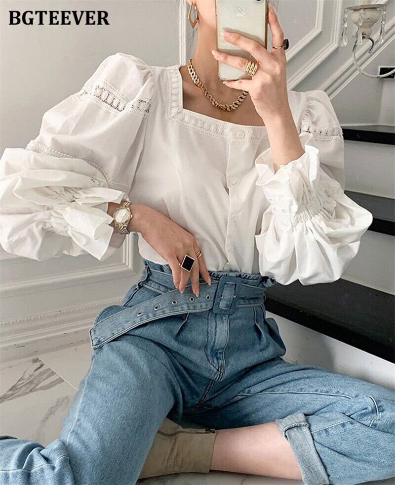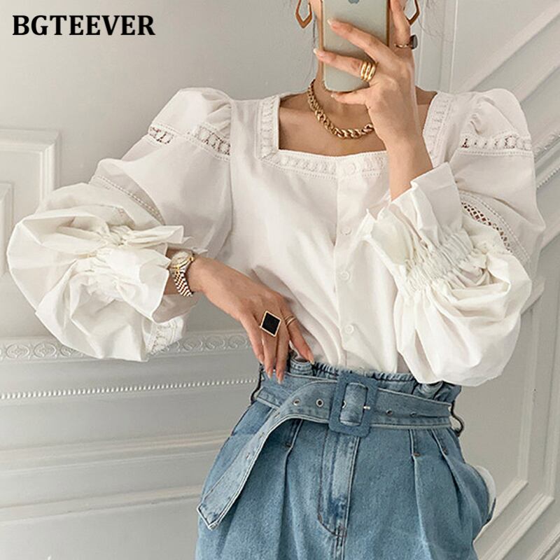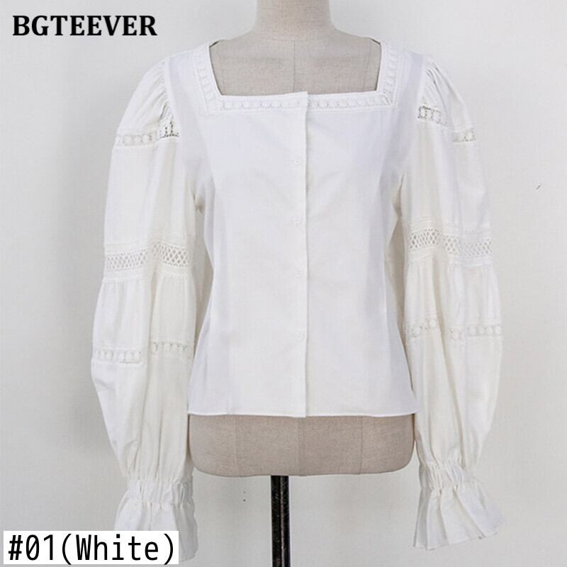 【新作】【送料無料】 BGTEEVERヴィンテージフルスリーブシングルブレストシャツレディーススクエアカラー中空ブラウス2021春 スプリング 春物 スクウェア ビンテージ 12b194095953078