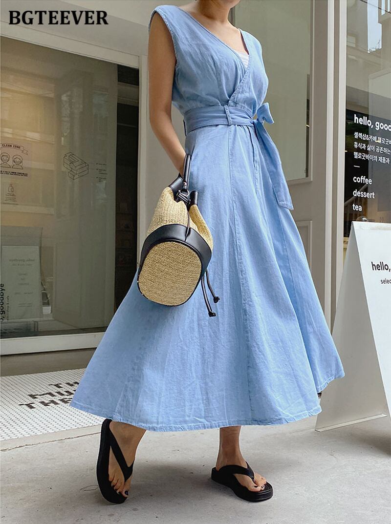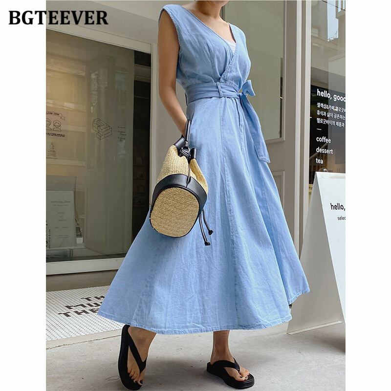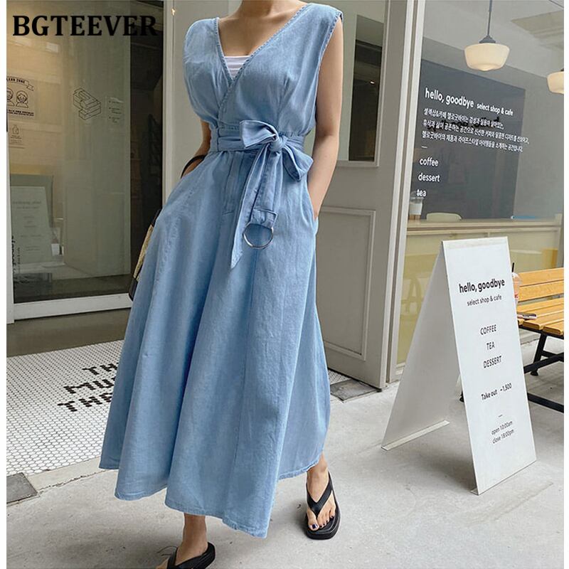 【新作】【送料無料】 BGTEEVERノースリーブVネックデニムドレスレディース春夏バックレススリムウエストベルト付きAラインジーンズドレス2021 スプリング 春物 サマー 夏物 ハーネス 12b161907045462