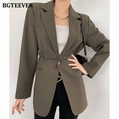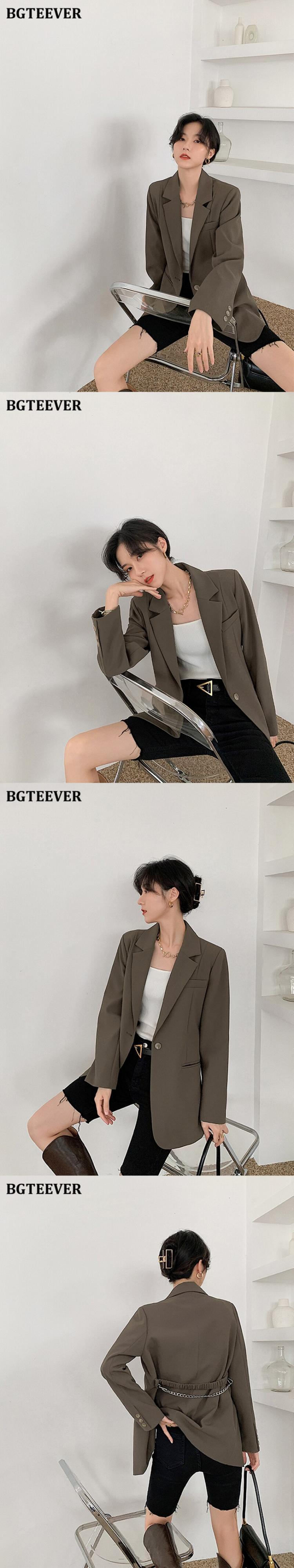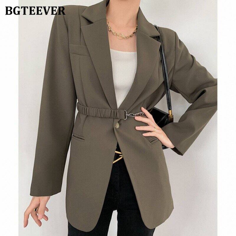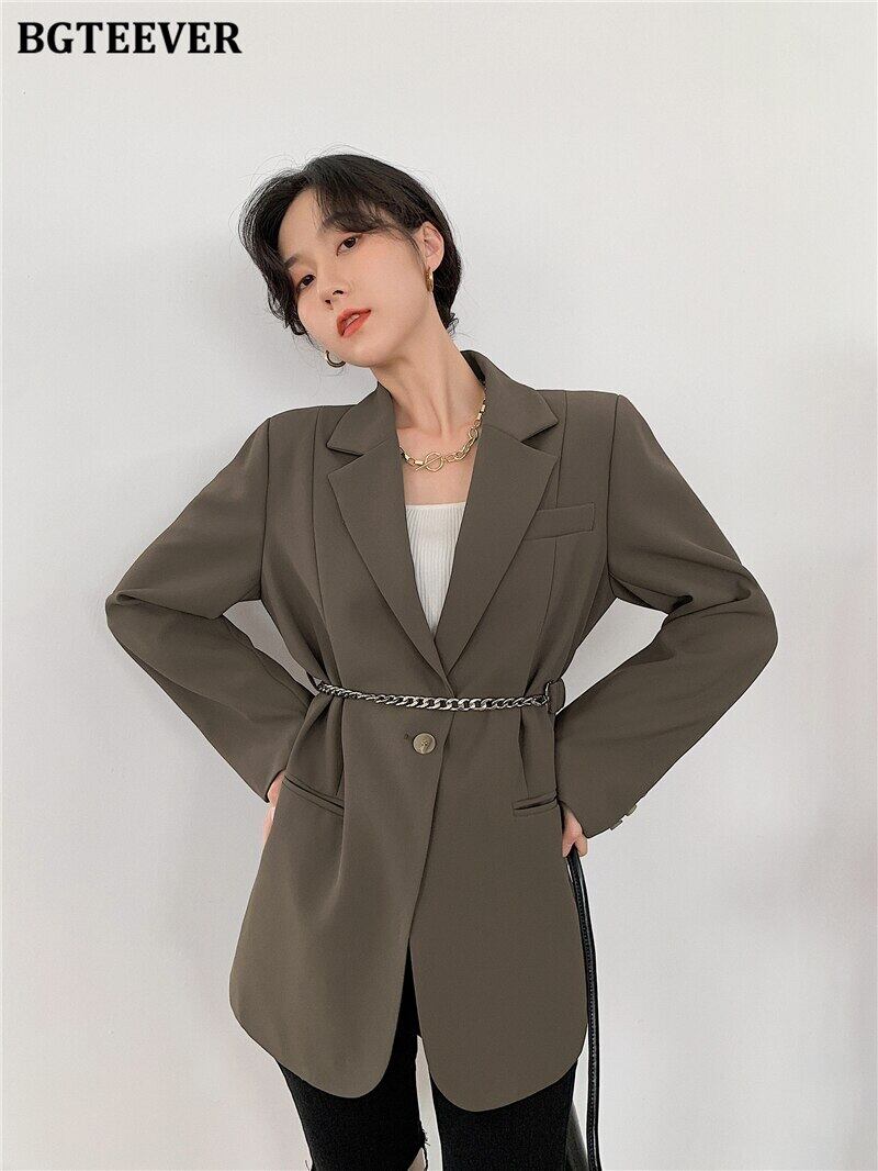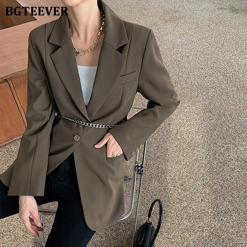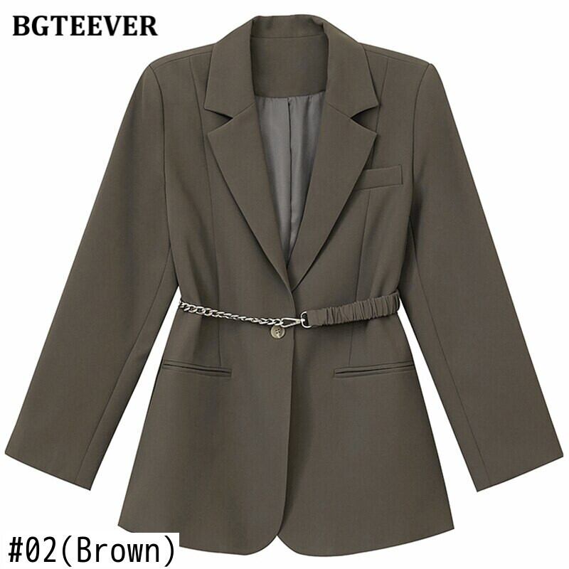 【新作】【送料無料】 BGTEEVERスタイリッシュなルーズシングルボタンレディースブレイザー2021春長袖チェーンサッシアウタートップスヴィンテージスーツジャケット ロング スプリング 春物 ビンテージ 12b183467457220