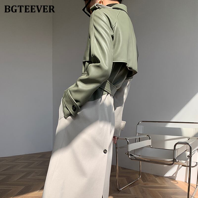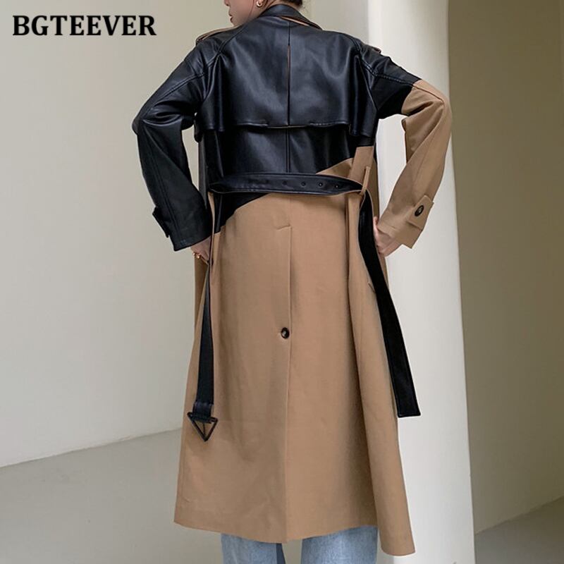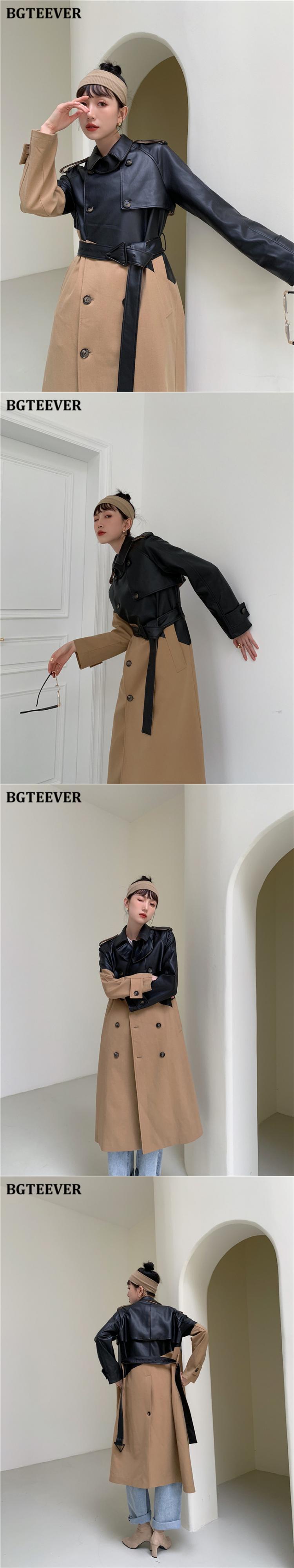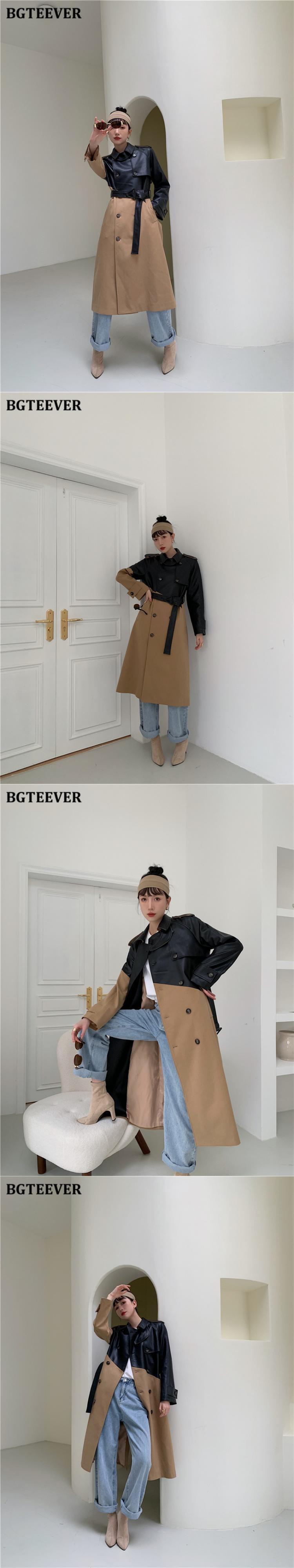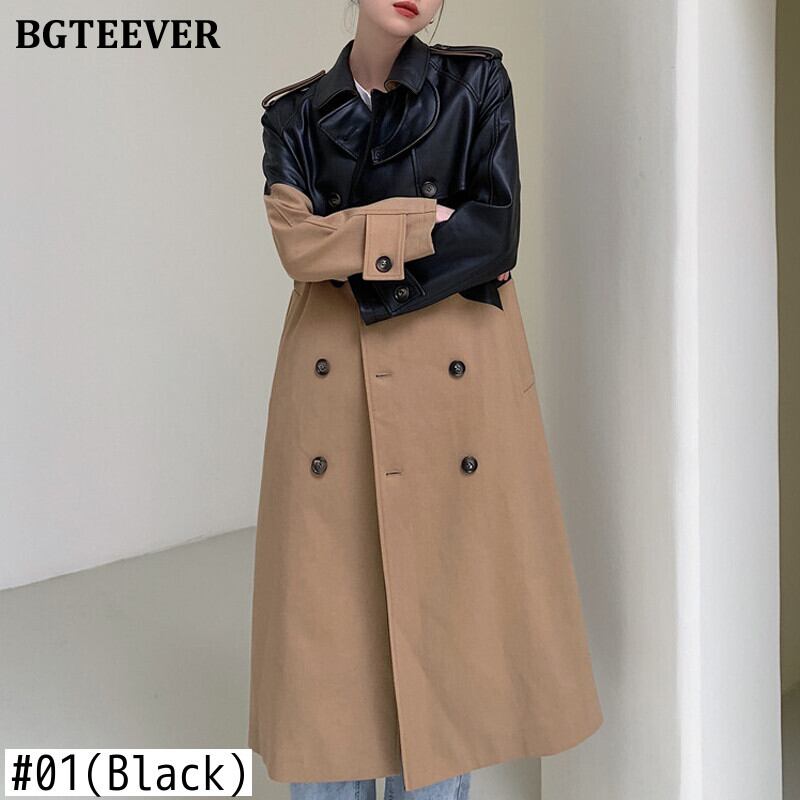 【新作】【送料無料】 BGTEEVERシックなターンダウンカラー女性パッチワークロングPUレザージャケットダブルブレストスタイリッシュなベルト付きフェイクレザーコート ハーネス ファー 12b199635542709