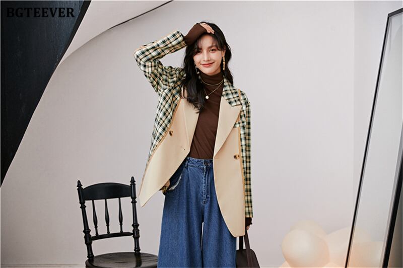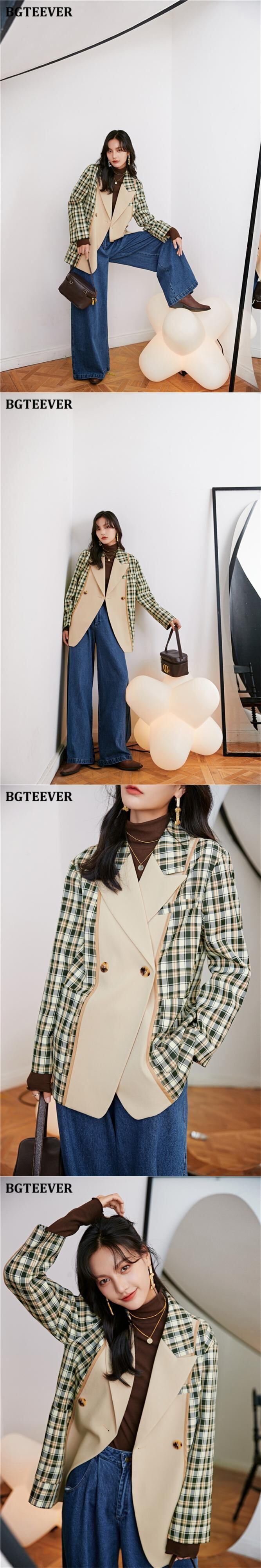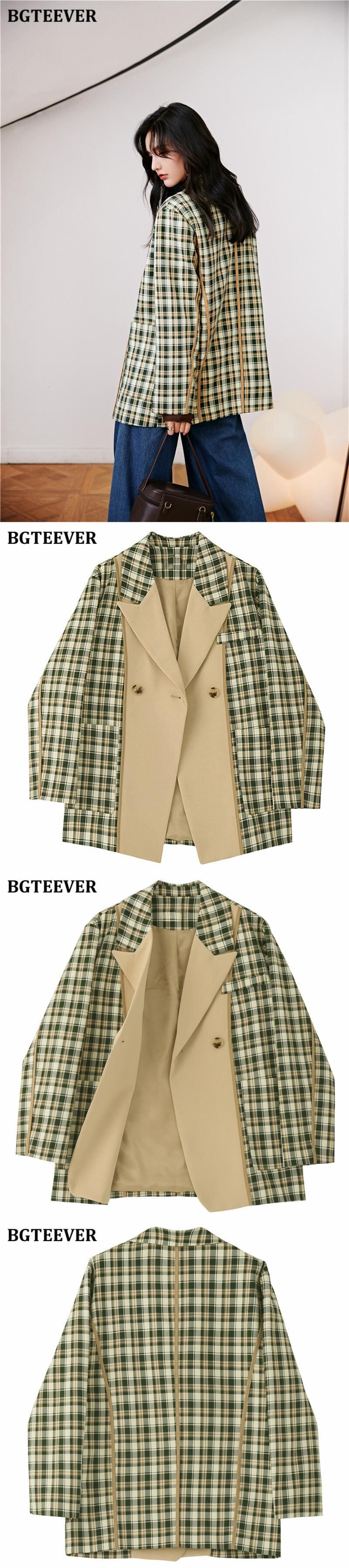 【新作】【送料無料】 BGTEEVERヴィンテージダブルブレストレディースパッチワークチェック柄ブレザージャケット長袖スーツジャケットルーズコート2021 ロング ビンテージ 12b140460762766