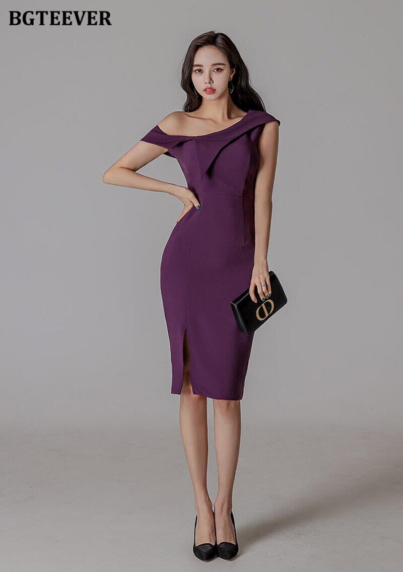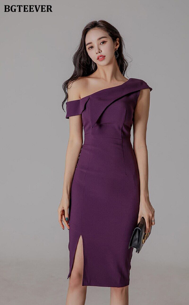 【新作】【送料無料】 BGTEEVERスタイリッシュなソリッドワンショルダー女性スキニーペンシルドレスパープルスプリットボディコンドレス2021春のVestidos スプリング 春物 ソリッドカラー 12b168789895430