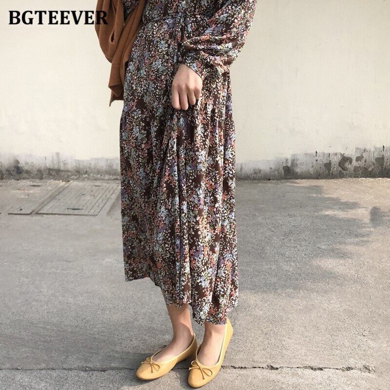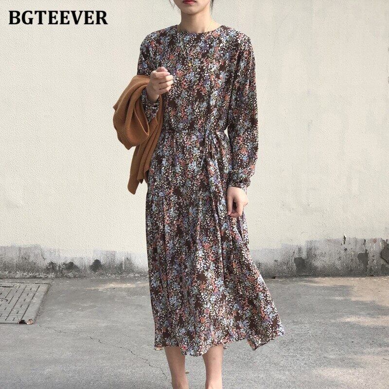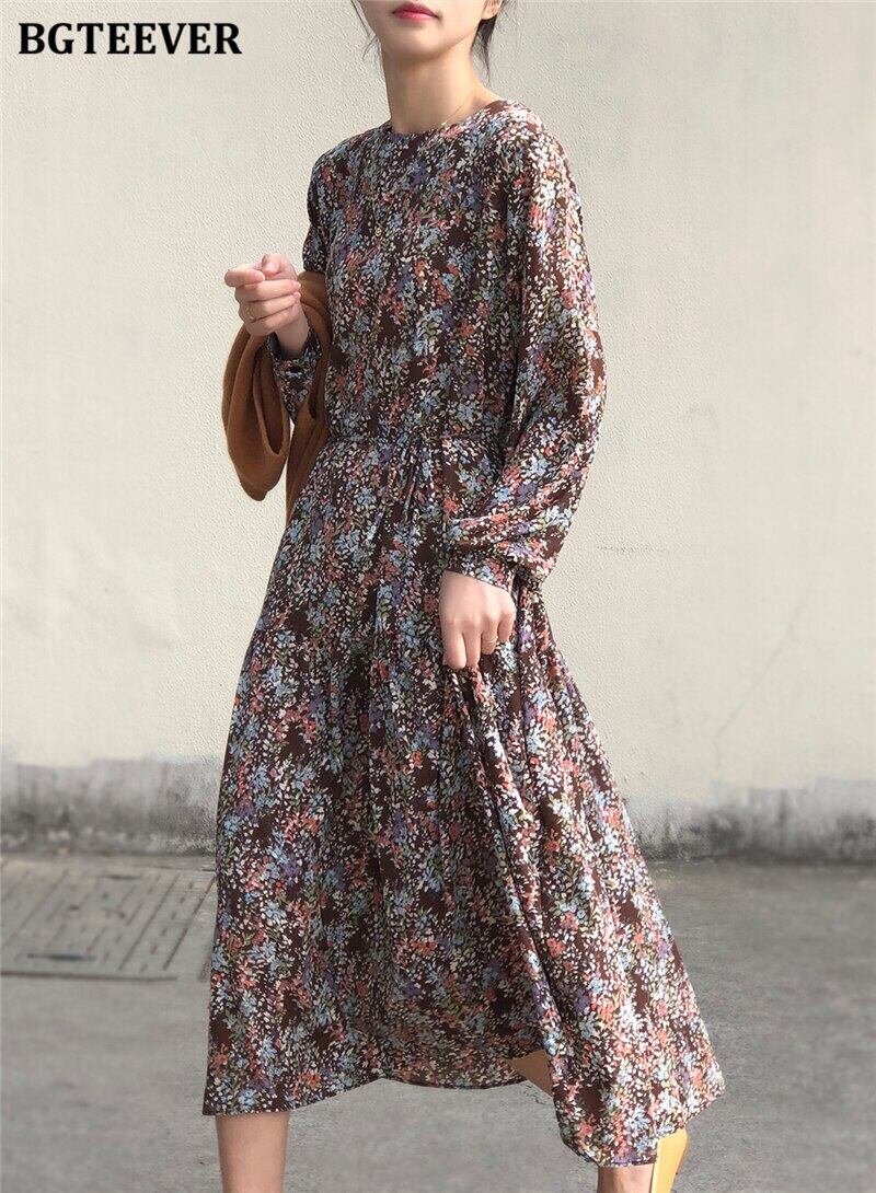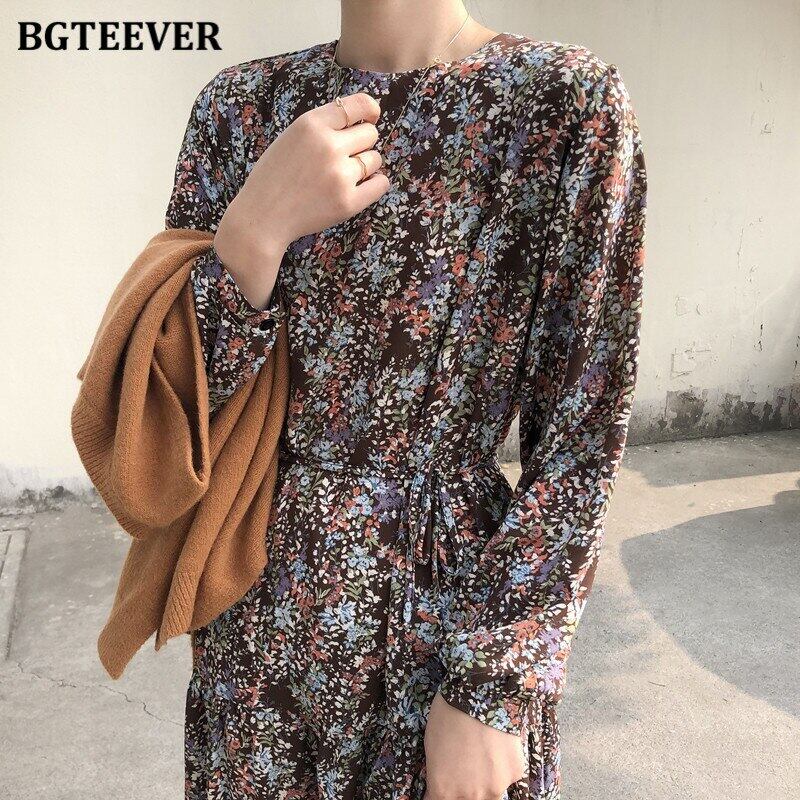 【新作】【送料無料】 BGTEEVERヴィンテージシックフローラルプリントOネックレディースミディドレス2021フルスリーブルーズレースアップロングドレスVestidos 花柄 ビンテージ 12b163711535738