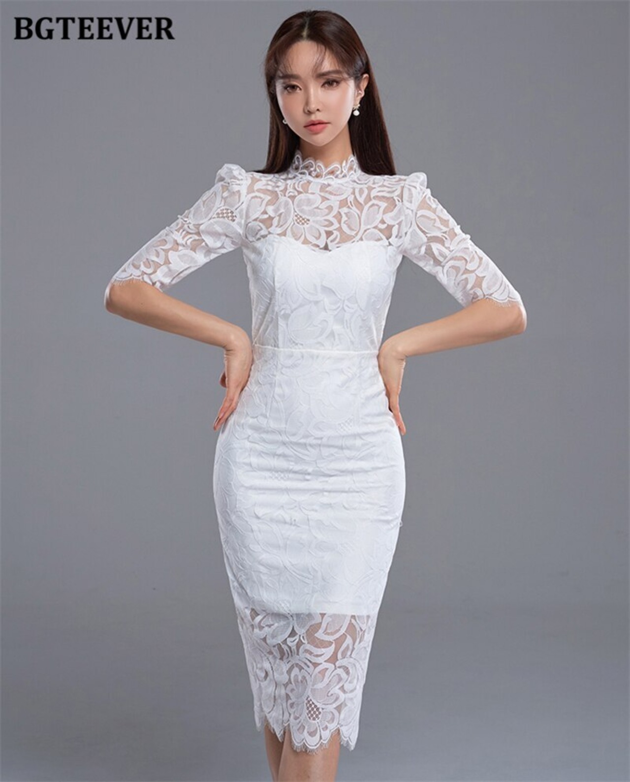 【新作】【送料無料】 BGTEEVERセクシースタンドカラーレディースレースシースボディコンドレスハーフスリーブスリムパッケージヒップドレススプリングソリッド 半袖 春物 ソリッドカラー 12b116364726023