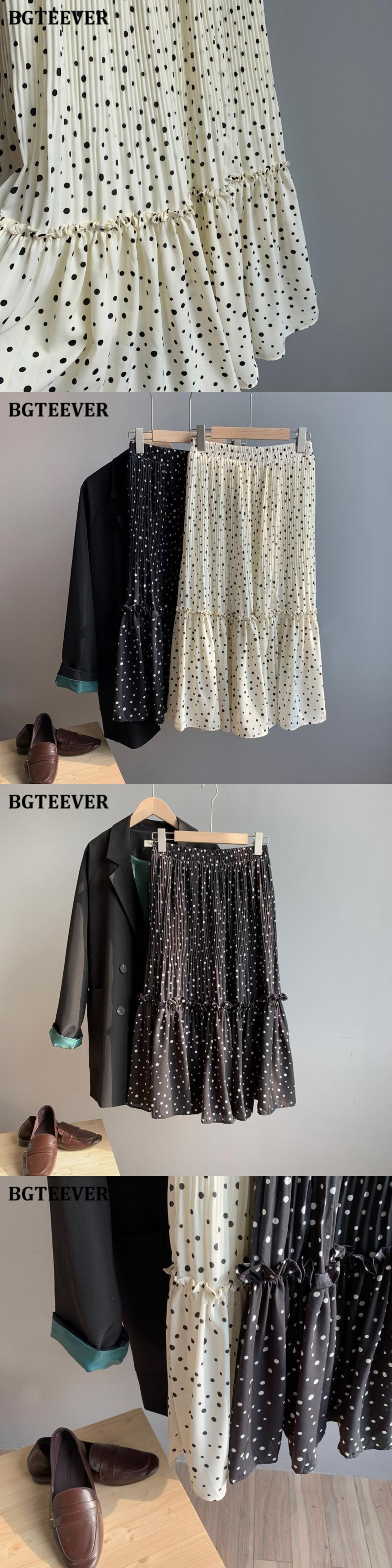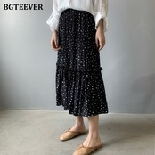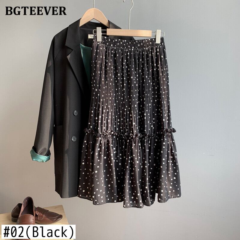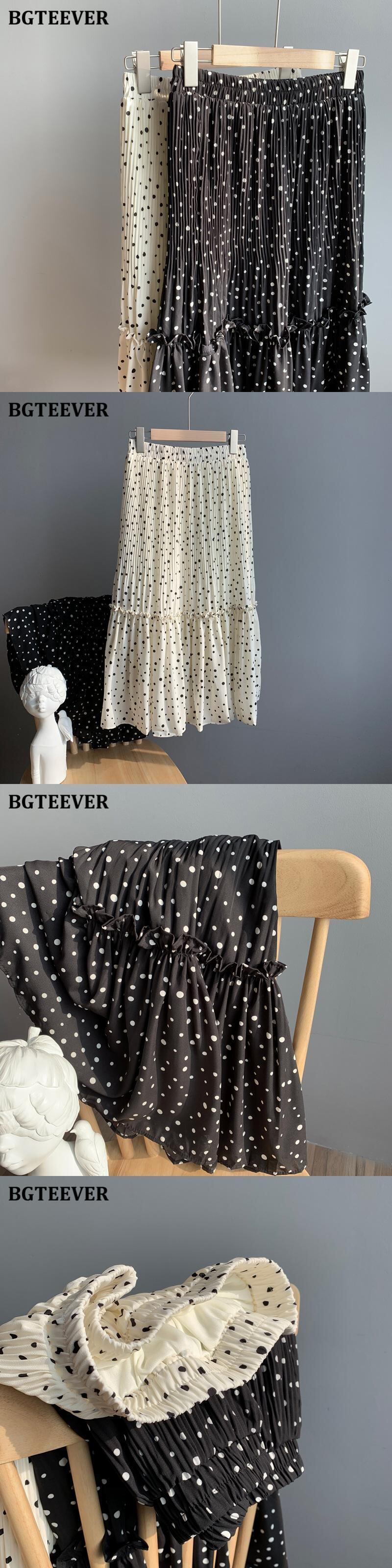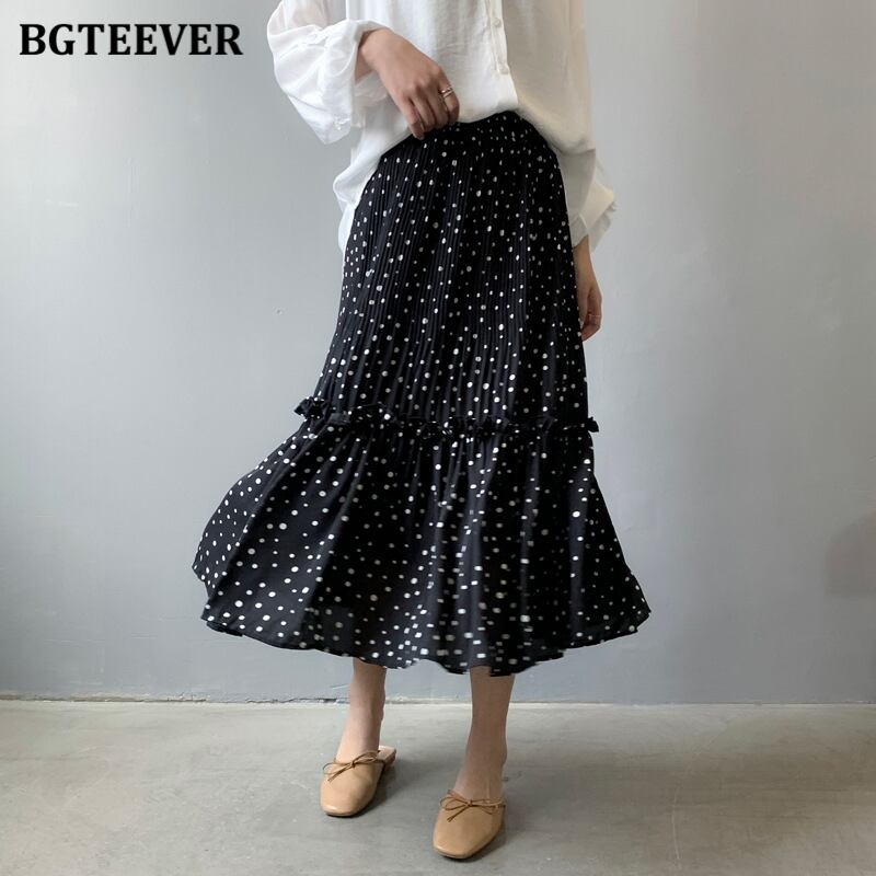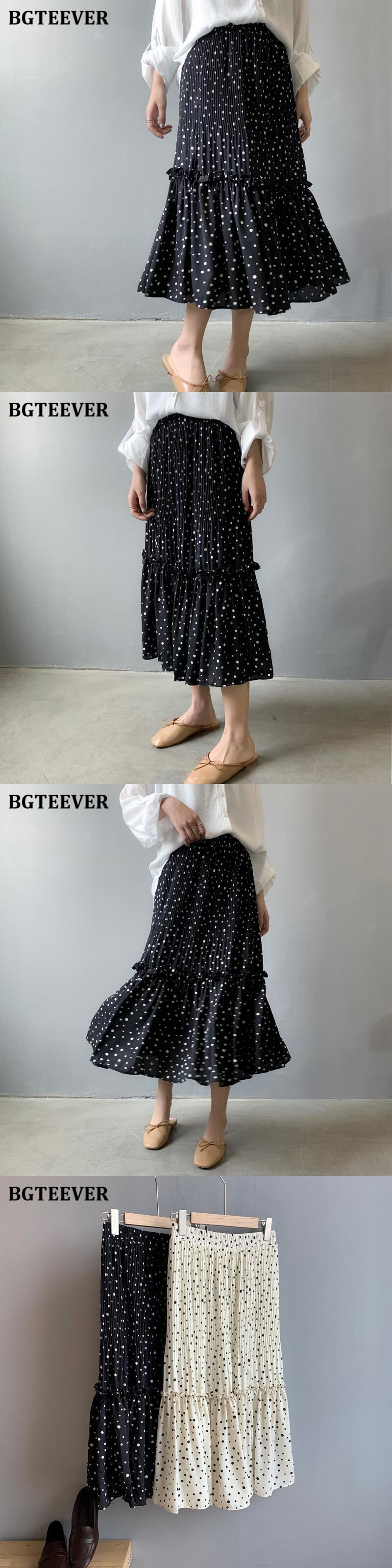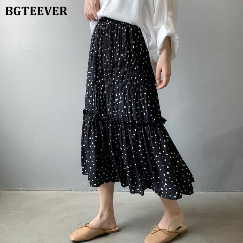 【新作】【送料無料】 BGTEEVER春夏ルーズ水玉プリントレディーススカート伸縮性ウエストフリルシフォンプリーツミディスカート2021 ラッフル エラスティック スプリング 春物 サマー 夏物 12b140767805724