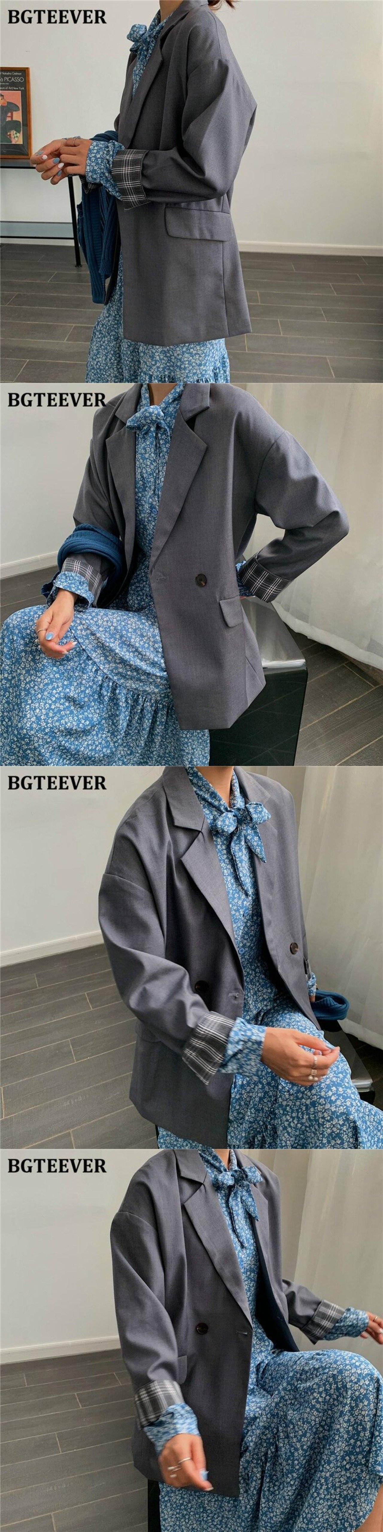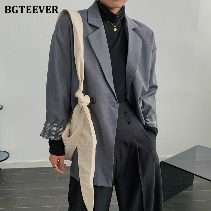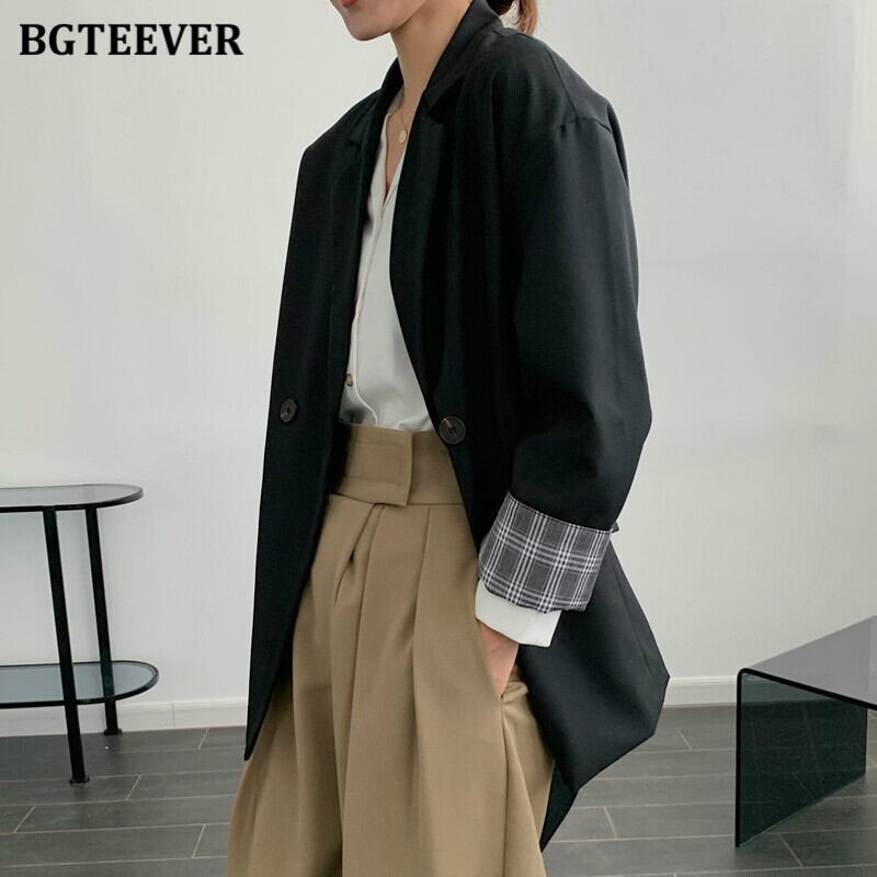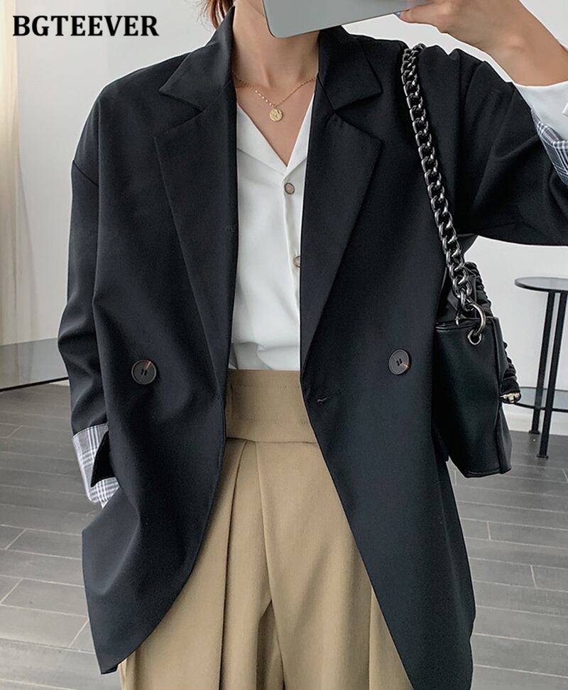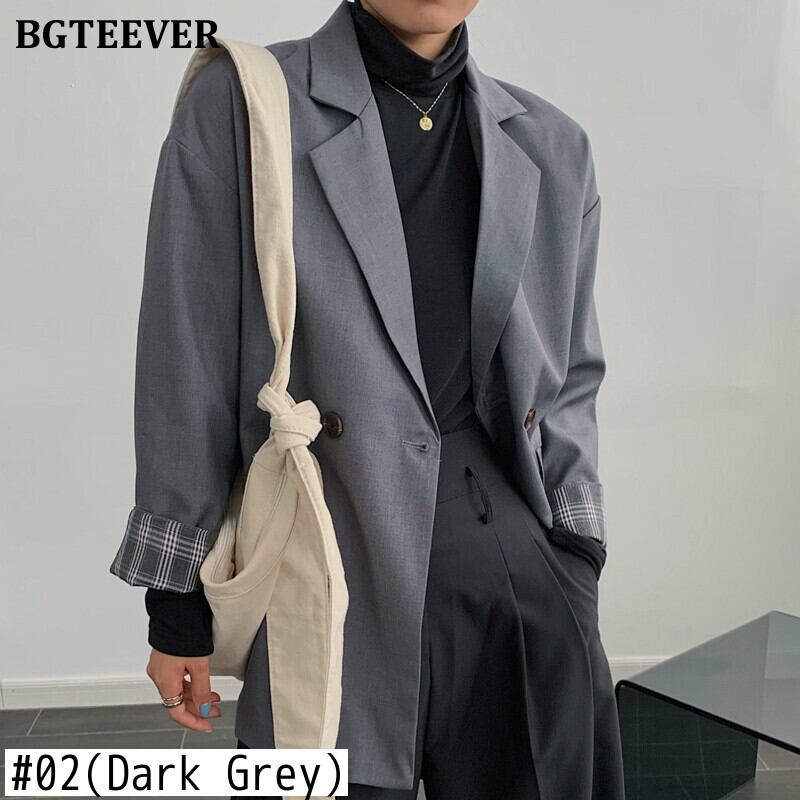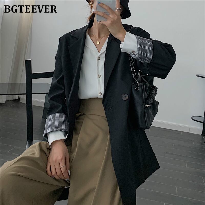 【新作】【送料無料】 BGTEEVERスプリングダブルボタンレディーススーツジャケットチェック柄パッチワークロングブレイザー2021フルスリーブルーズコート 春物 12b166073517459