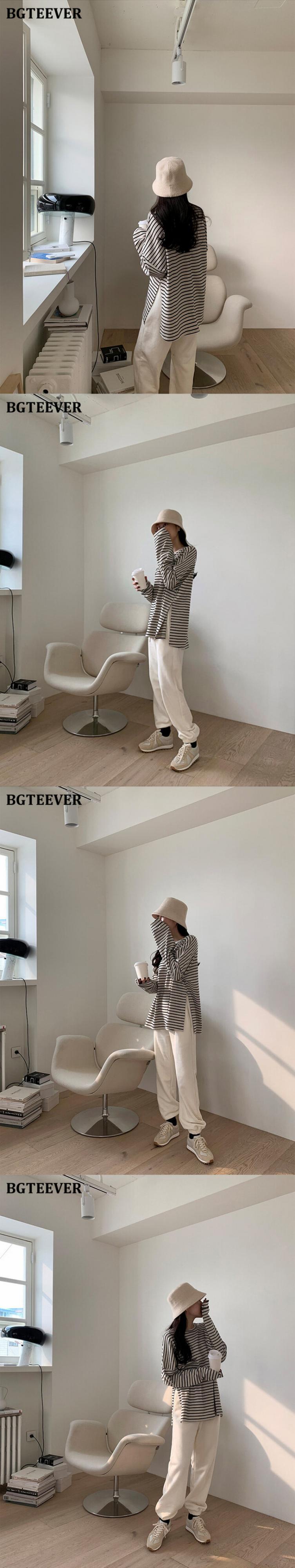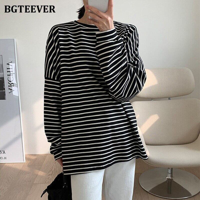 【新作】【送料無料】 BGTEEVERシンプルストライプルースウィミンTシャツ長袖サイドスプリットプルオーバートップス2021スプリングOネックTシャツ ロング 春物 12b113247769476