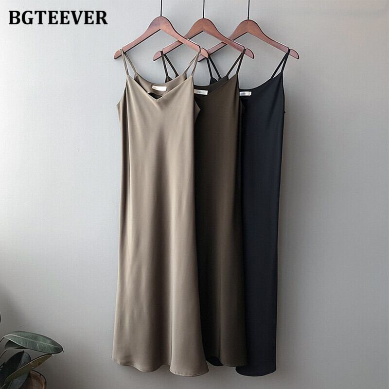 【新作】【送料無料】 BGTEEVERルースウィミンサマーサテンドレスVネックノースリーブルースロングドレス2021スパゲッティストラップベストミディドレス 夏物 12b173440879224