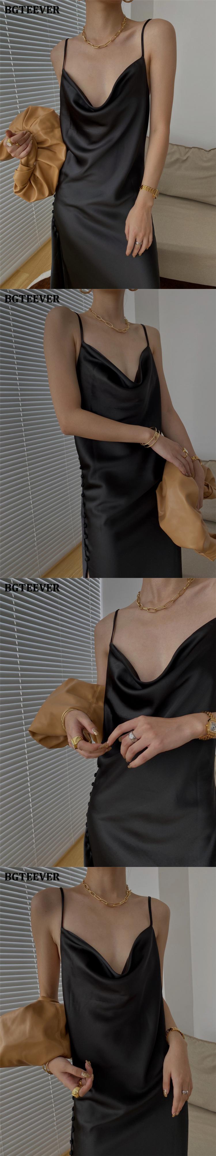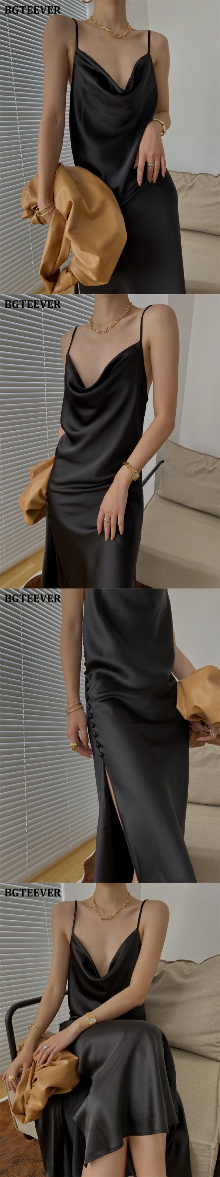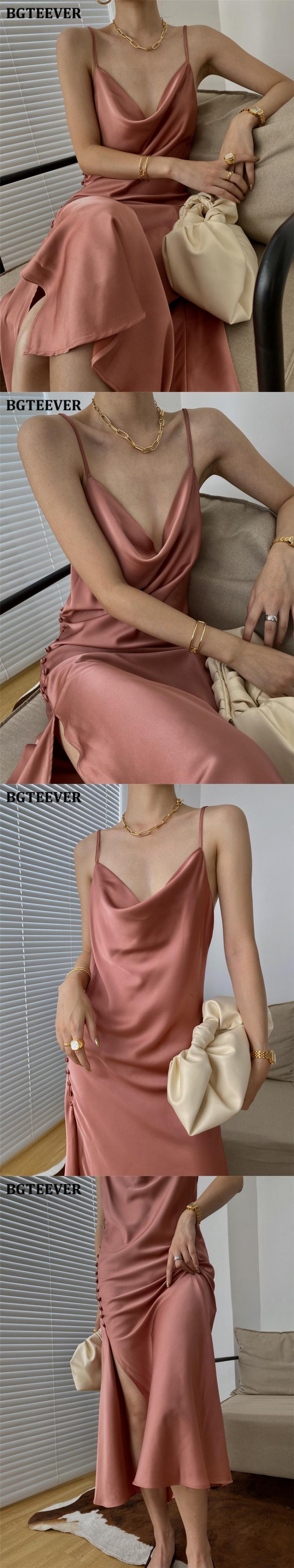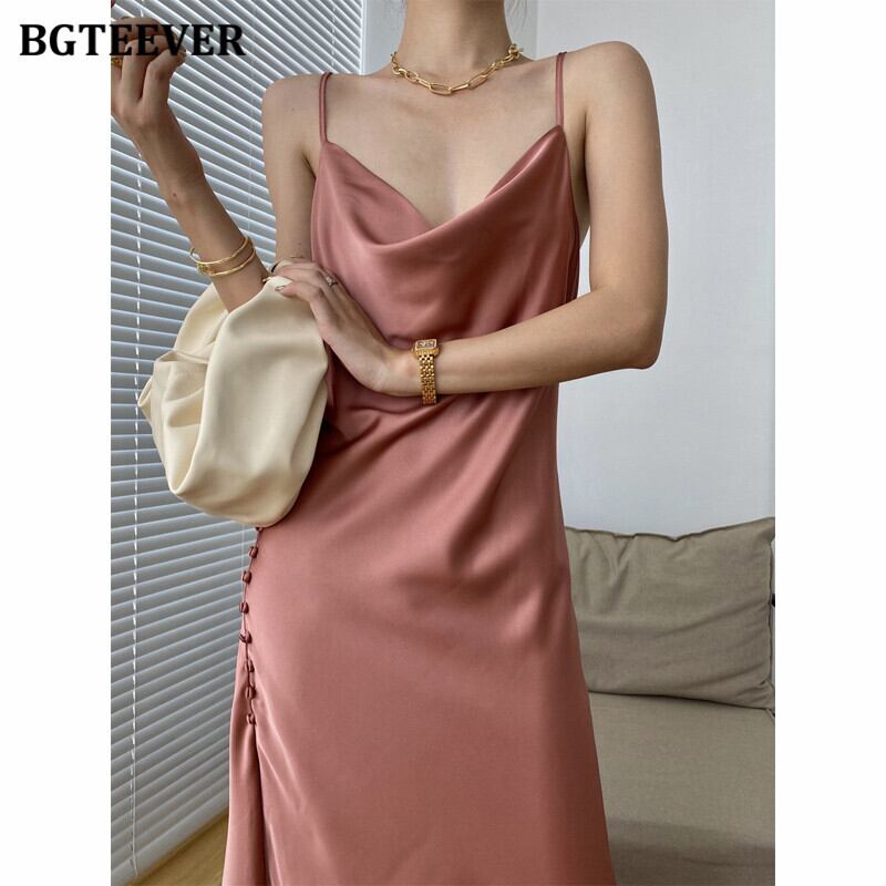 【新作】【送料無料】 BGTEEVERヴィンテージサイドスプリットボタンレディースサテンドレスVネックノースリーブロングドレス2021サマースパゲッティストラップベストドレス 夏物 ビンテージ 12b156531240026