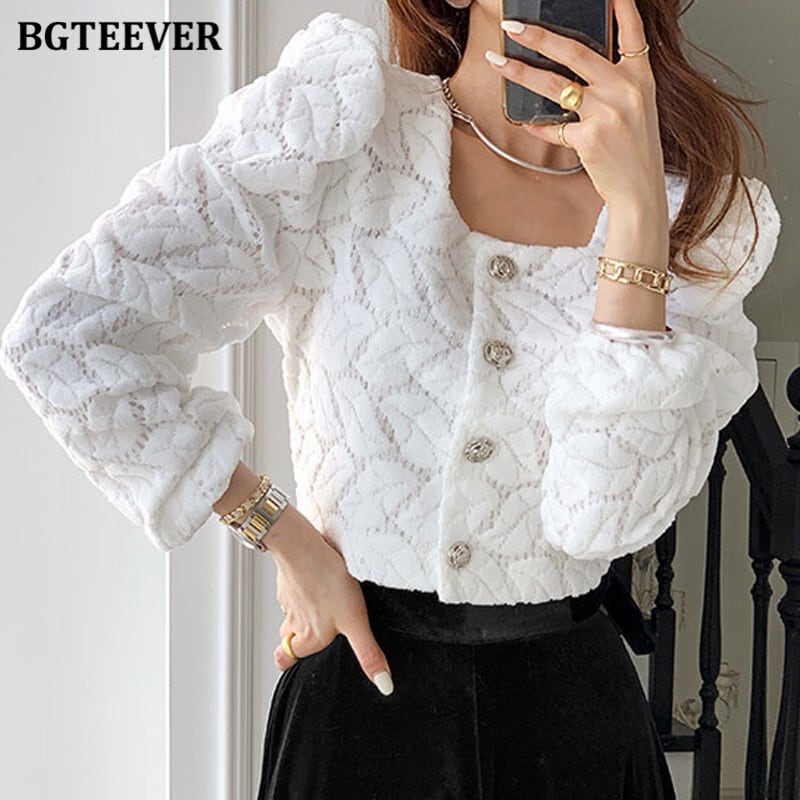 【新作】【送料無料】 BGTEEVERスクエアカラーレースレディースホワイトシャツブラウス長袖ルーズシングルブレストシャツ2021 ロング スクウェア 12b17826190380
