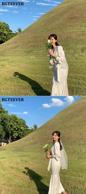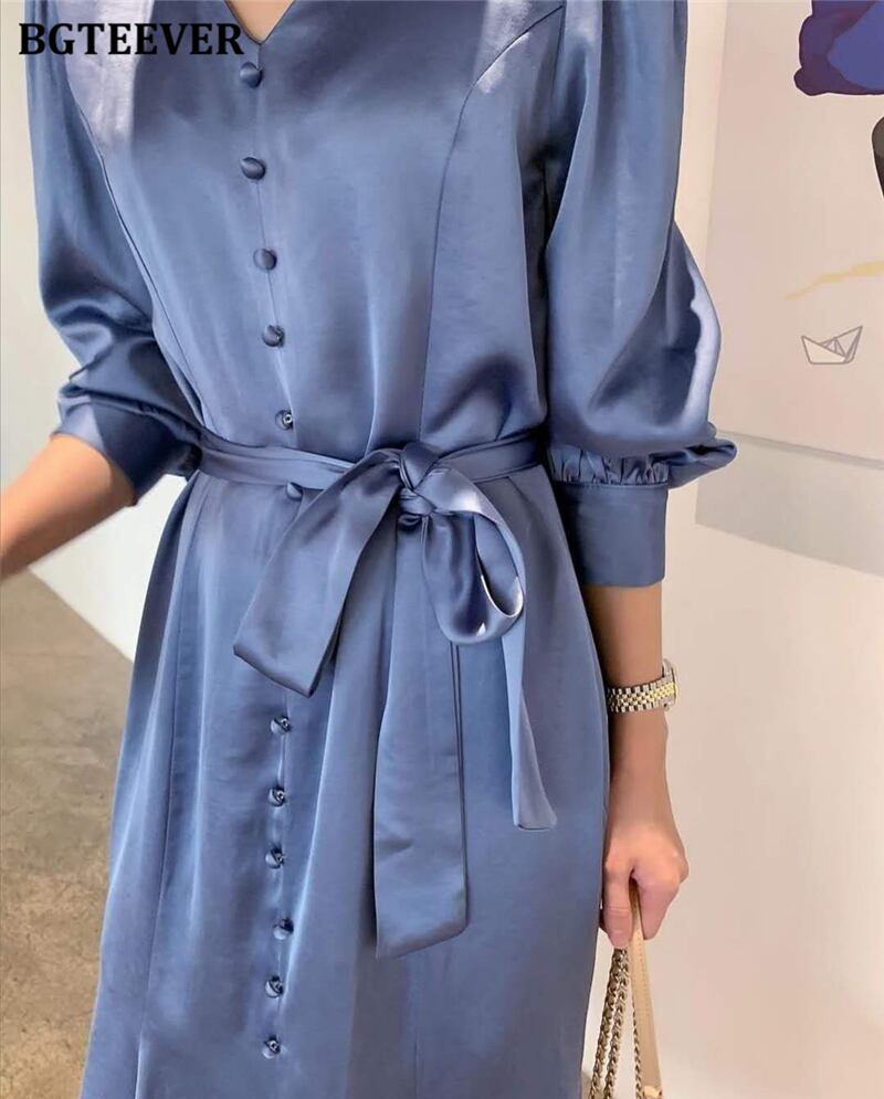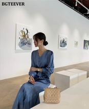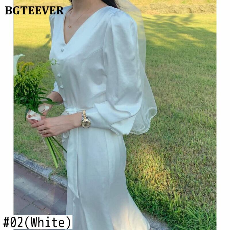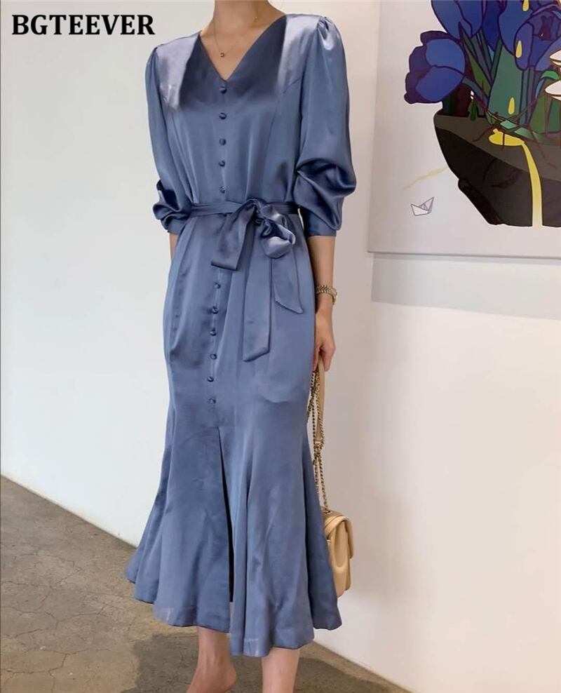 【新作】【送料無料】 BGTEEVERVネックルースウィミンサテンドレス2021年夏長袖シングルブレストレースアップロングマーメイドドレス サマー 夏物 12b185781535487
