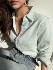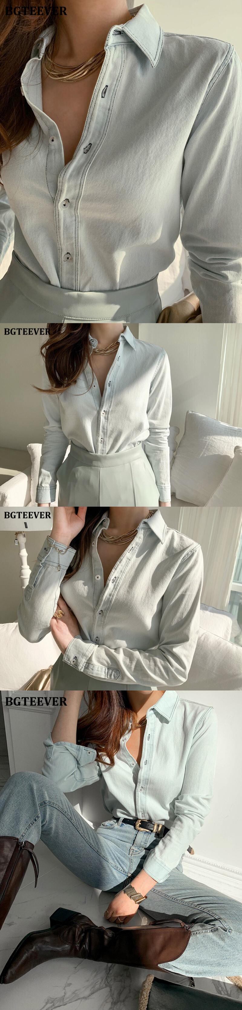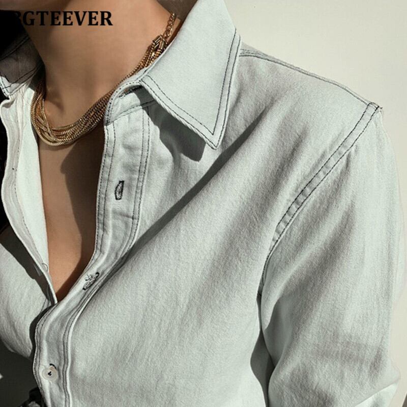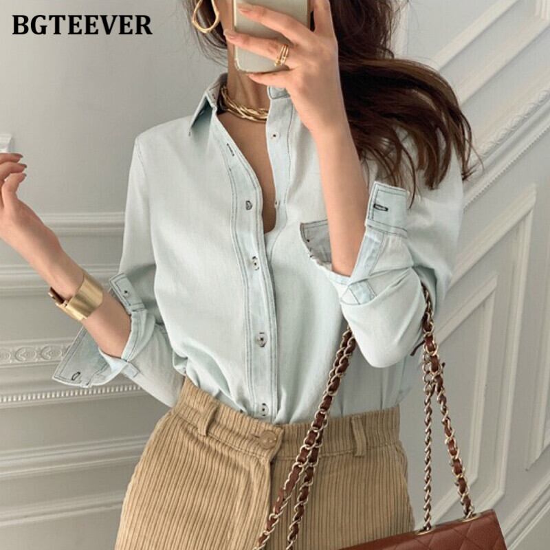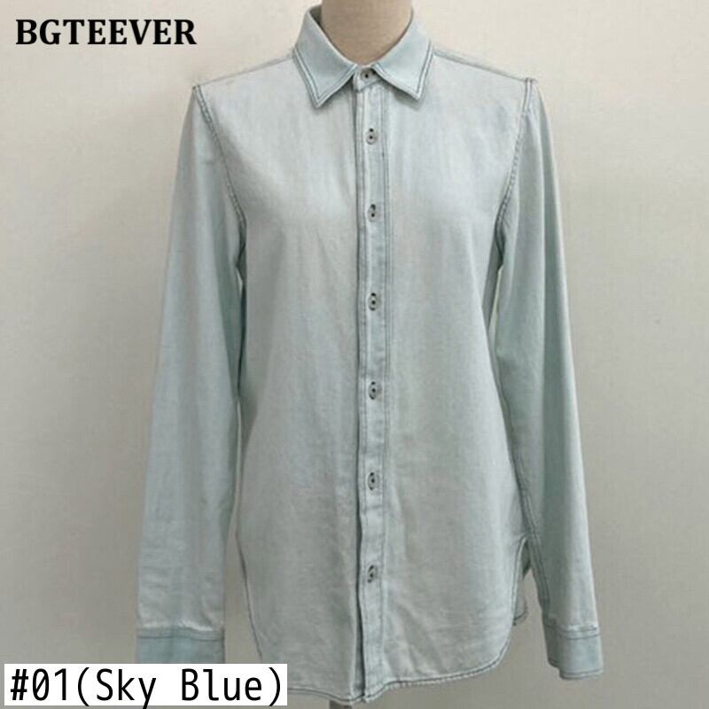 【新作】【送料無料】 BGTEEVERスプリングターンダウンカラーデニムシャツ女性2021ルーズシングルブレストブラウストップス 春物 12b110686364861