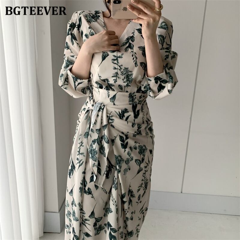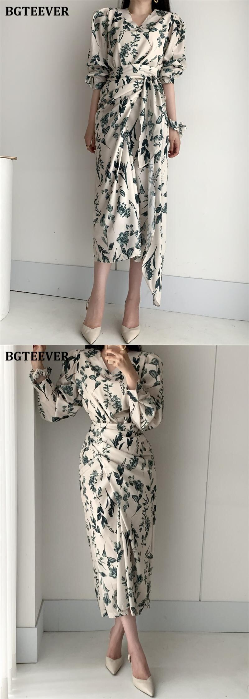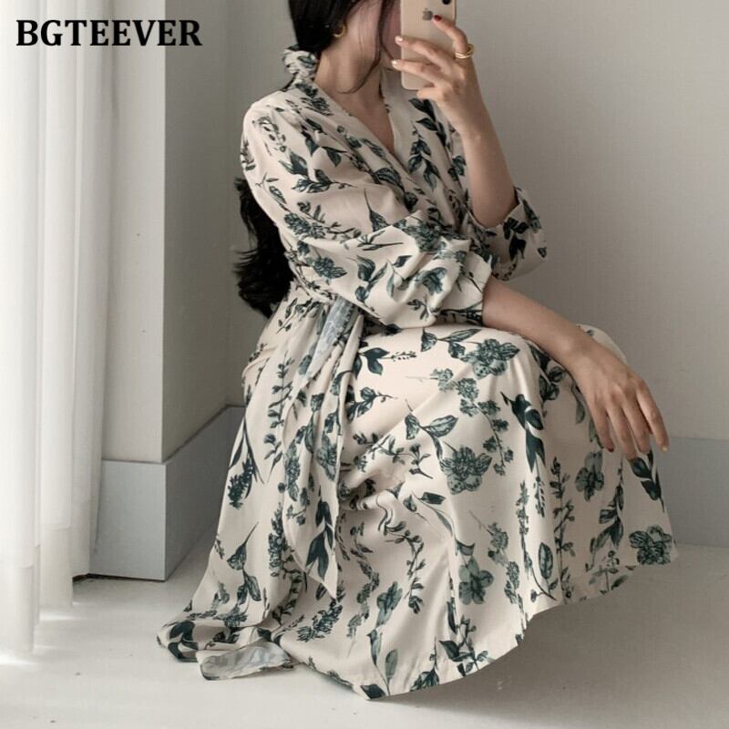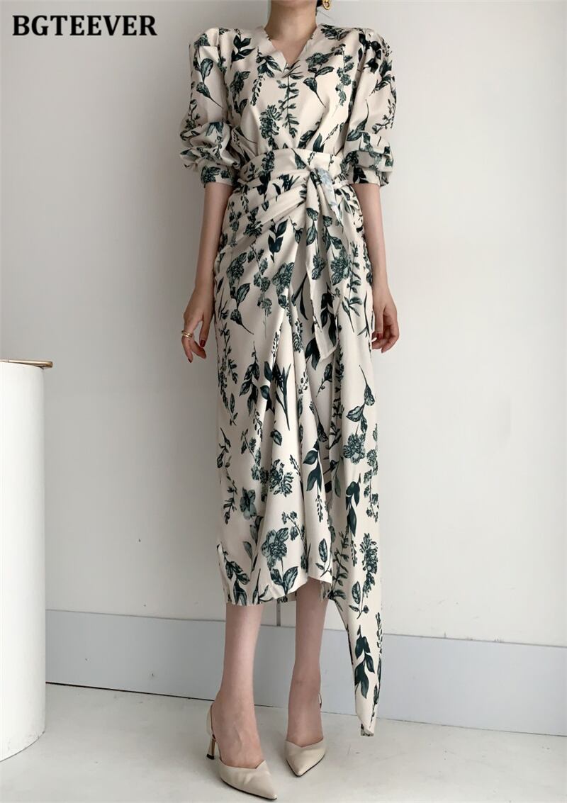 【新作】【送料無料】 BGTEEVERフローラル不規則な女性のドレス夏のVネック長袖ドレス2021春のレースアップVestidos ロング スプリング 春物 サマー 夏物 花柄 12b122954284163