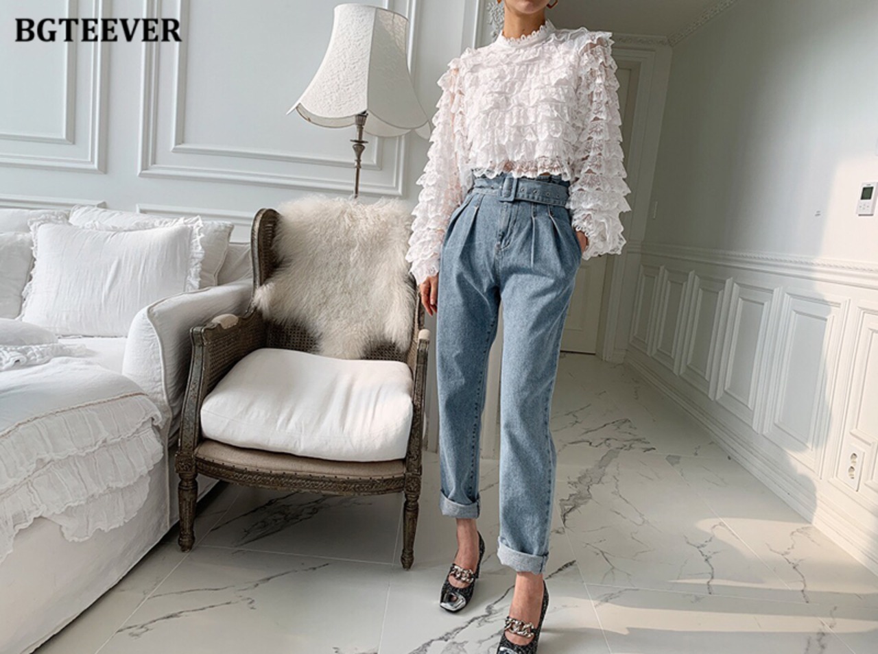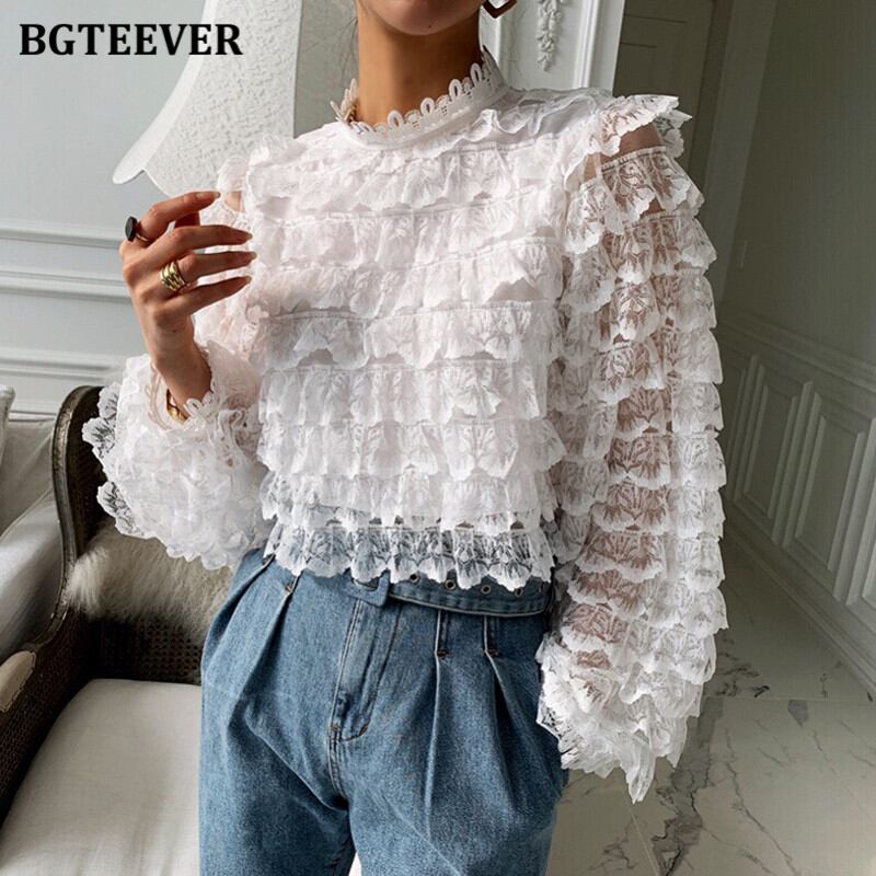 【新作】【送料無料】 BGTEEVERスタイリッシュなスタンドカラーレースシャツトップス女性夏フルスリーブルーズブラウス2021カスケード サマー 夏物 12b186905530676