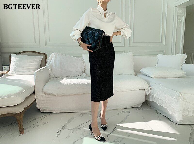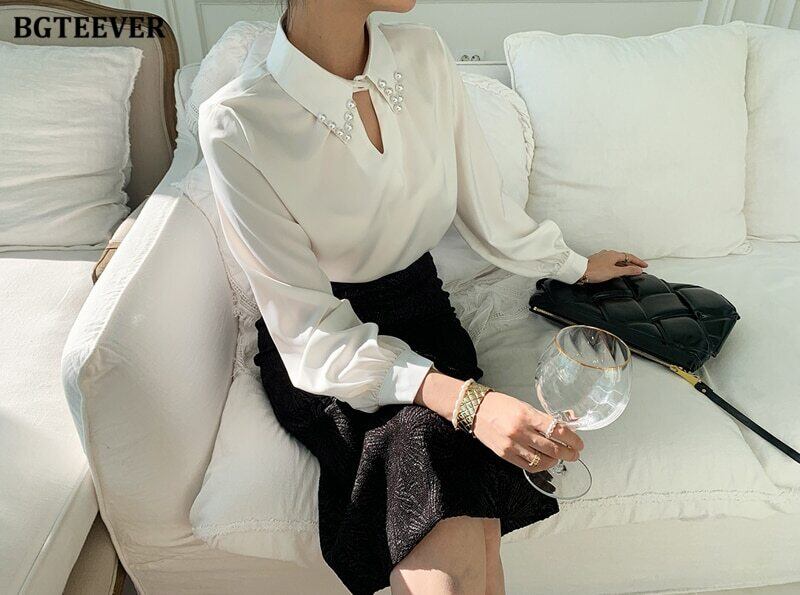 【新作】【送料無料】 BGTEEVERスタイリッシュな女性の中空シャツブラウスターンダウンカラービーズ長袖ルーズ2021春 ロング スプリング 春物 12b130750776281