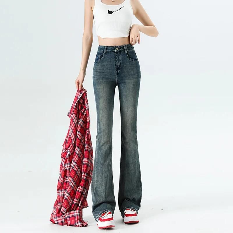女性用ハイウエストマイクロフレアジーンズ,レトロ,ブルー,スリム,コットン,伸縮性,文字の刺embroidery,カジュアル,春,夏
