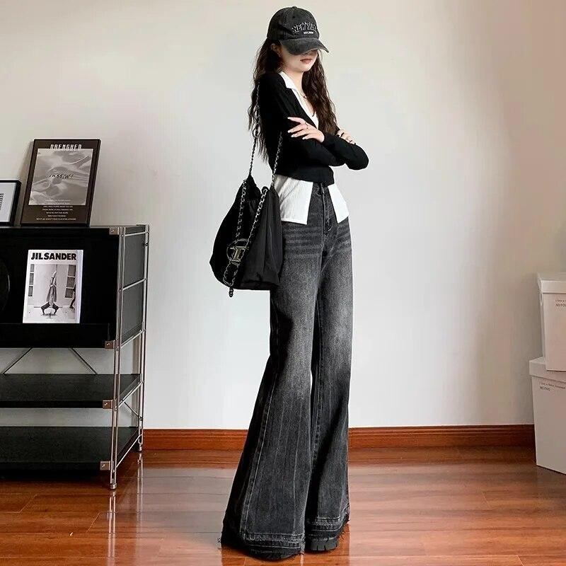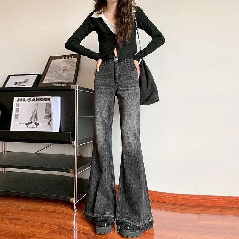 女性のためのアメリカのレトロなマイクロフレアジーンズ,春と秋,ナットガールデザイン,毛皮のエッジ,ハイウエスト,ルーズフィットレッグジーンズ