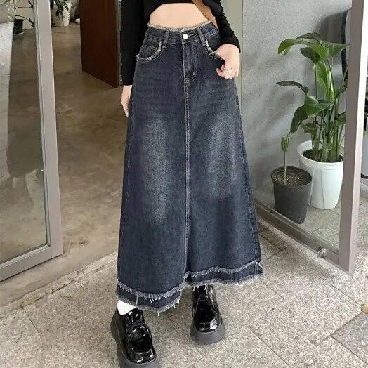女性用生エッジタッセルデニムスカート、バトックラップアップ、ハイウエスト、カジュアル、レトロ、ヴィンテージ、Aライン、オリジナル、春、夏