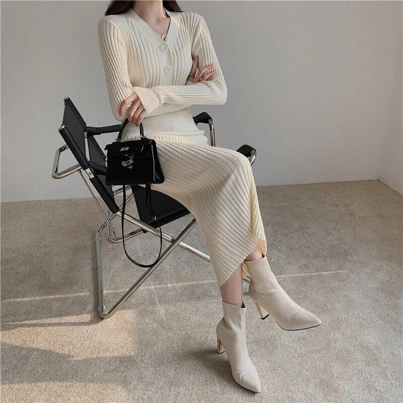 女性のための縦縞デザインのニットドレス,オリジナルの伸縮性ウエスト,Vネック,長袖,スリム,春と秋