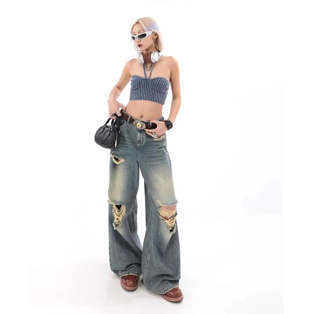 女性のレトロなウォッシュドディストレストジーンズ、ハイウエスト、ルーズフィット、ストレート、ワイド、ストリートトレンドセッター、春と夏、y2k