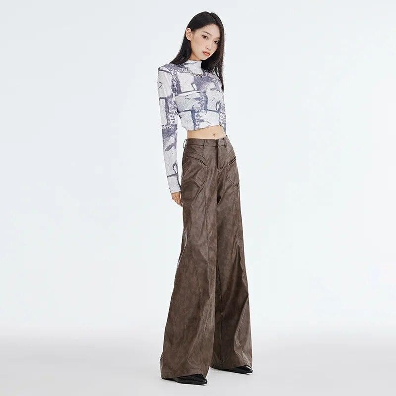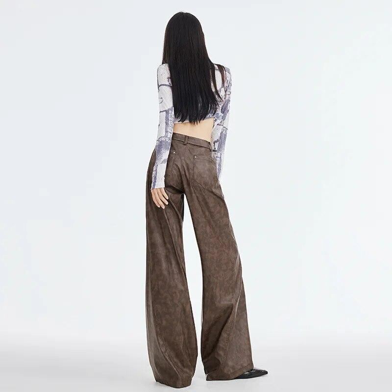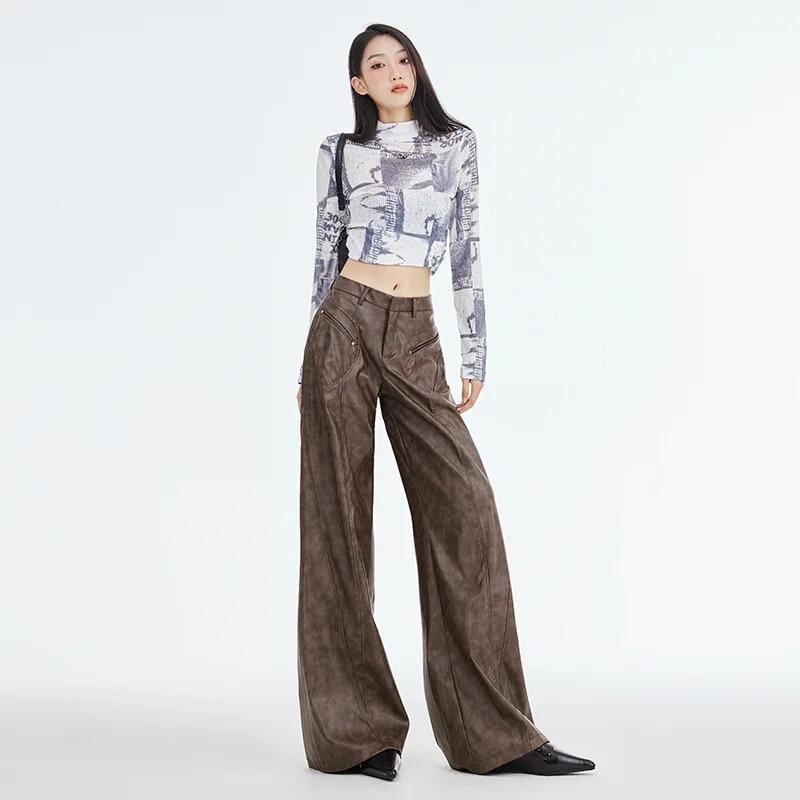 女性用ワイドレッグパンツ,ブラウン,PU,ストリートファッション,ハイウエスト,ルーズ,ストレート,春と夏,個性,女の子,y2k