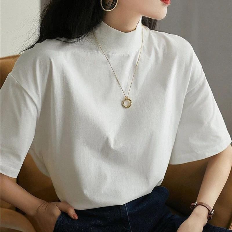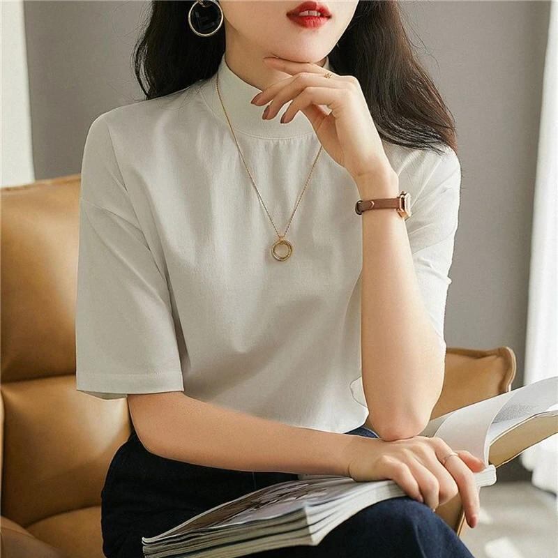 Gidyq-女性用ハーフタートルネックルーズ半袖プルオーバー、エレガントな女性用Tシャツ、韓国デザイン、すべてマッチ、夏のファッション_41