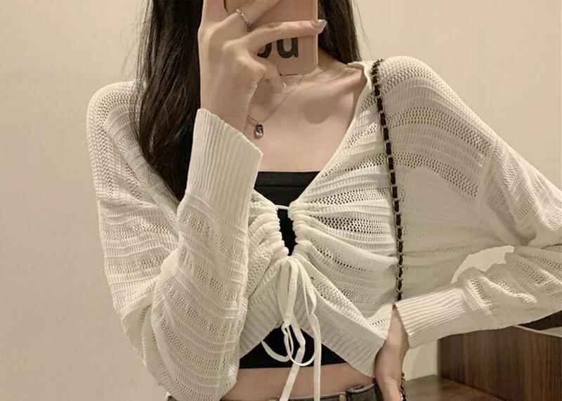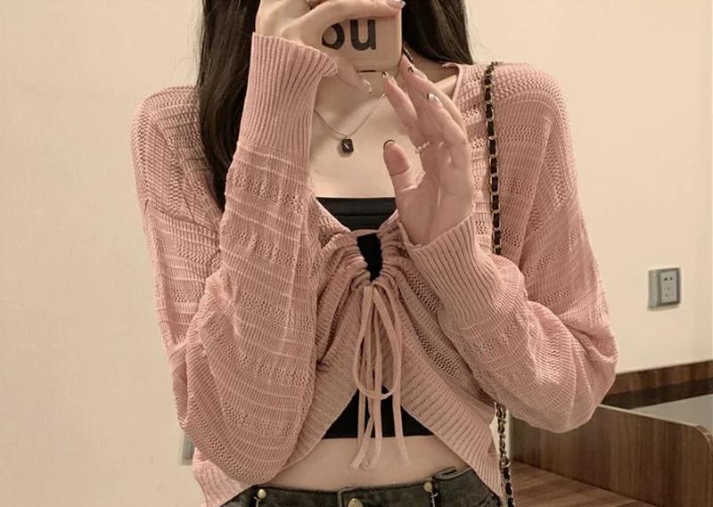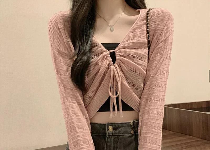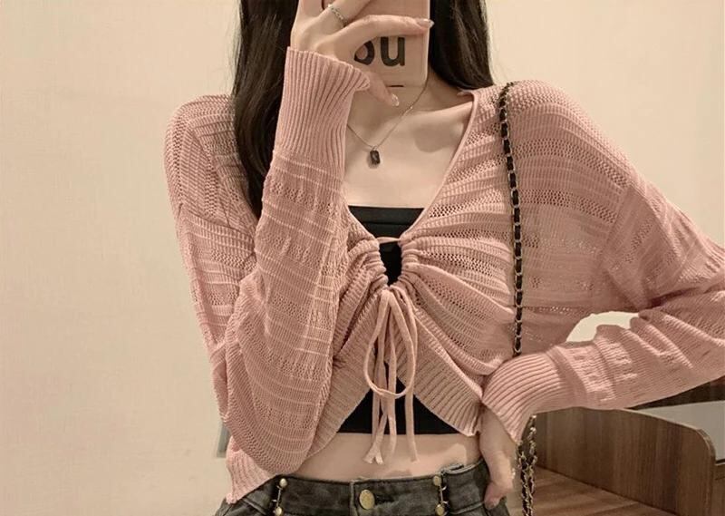 Gidyq-女性のためのピンクの中空アウトカーディガン、甘いカワイイシャツ、スリムな女性のシャツ、単色、すべてのマッチ、引きひも、vネック、女性のトップ、夏、新しい_69