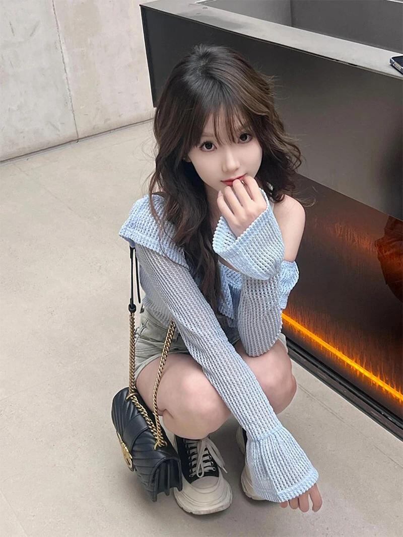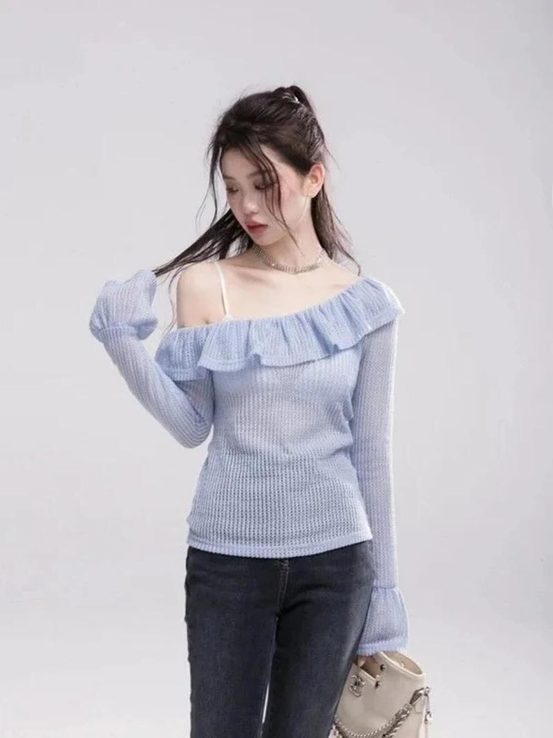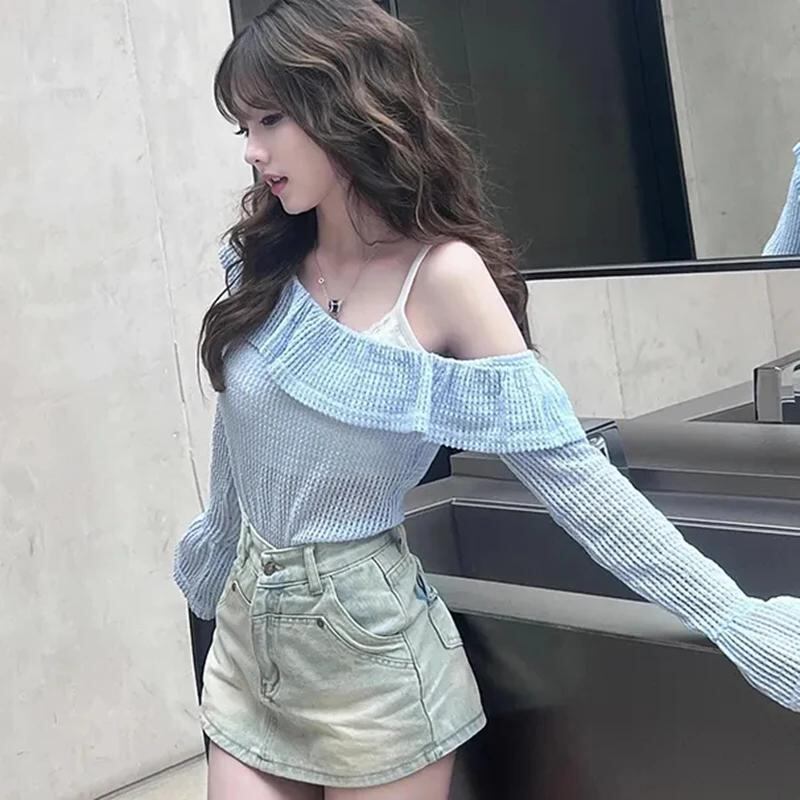 Gidyq-女性の青いスキューカラーシャツ、韓国のファッション、ストリートウェア、フリル、女性のブラウス、夏のカジュアル、すべてが一致、ホットソフト、中空トップス_103