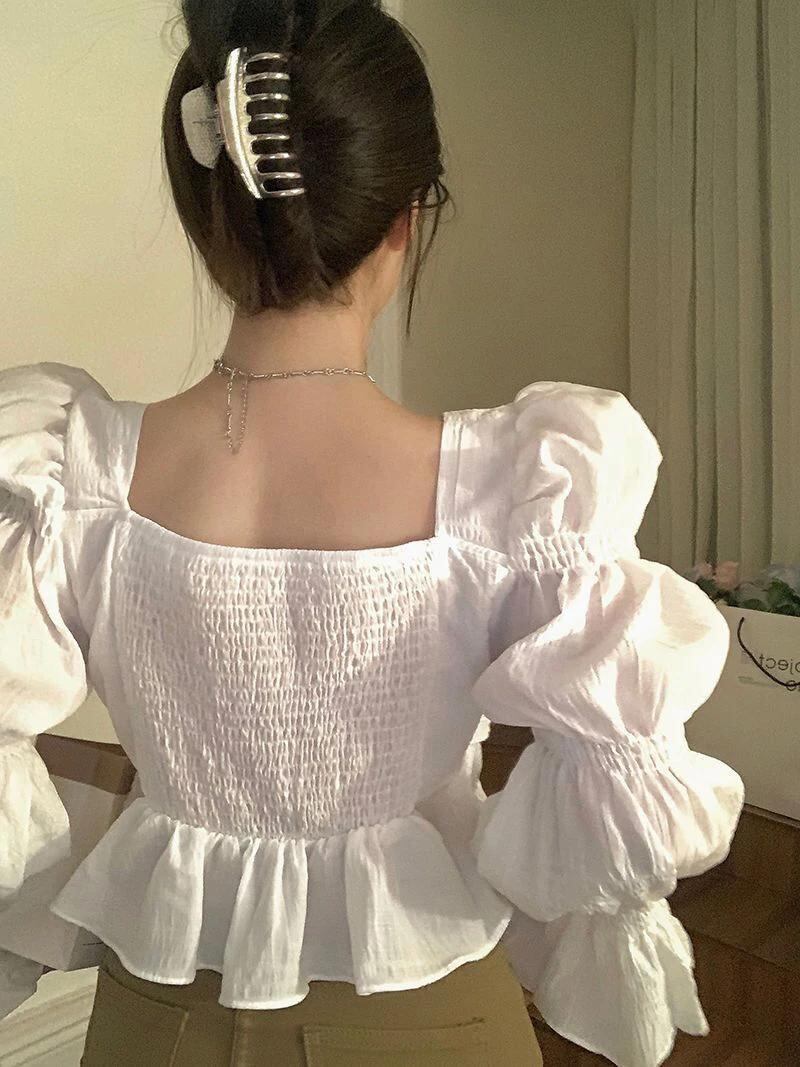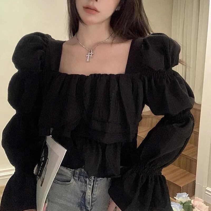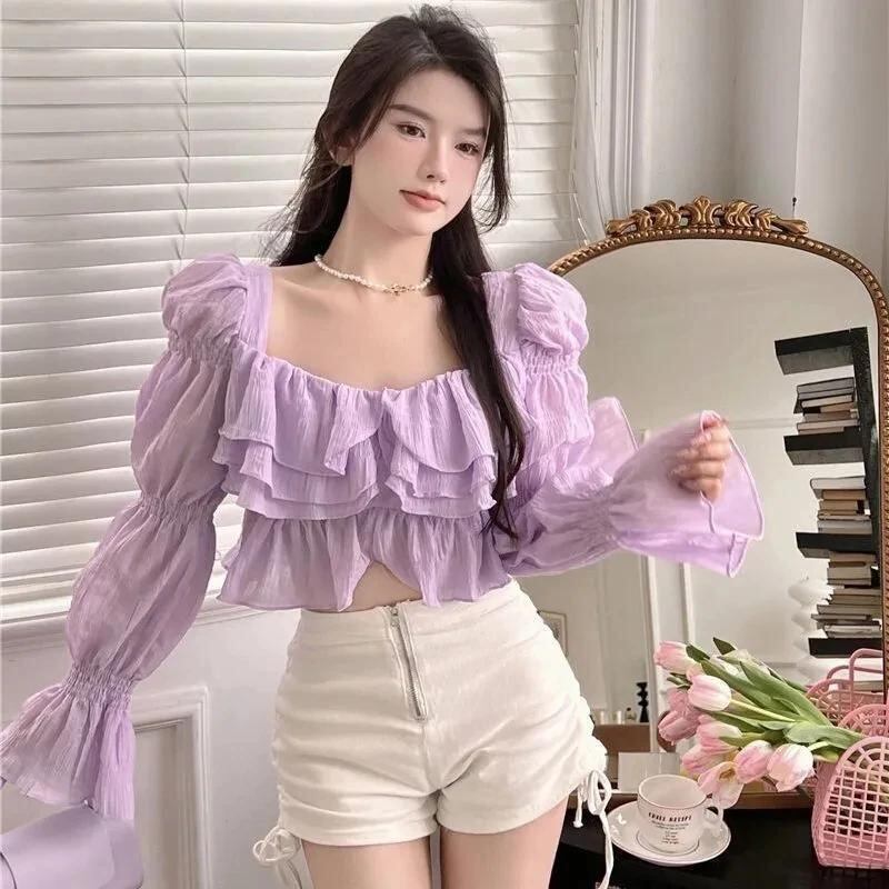 Gidyq-フリル、クロップトップ、エレガント、シック、女性のファッション、セクシーなプレッピースタイル、ソリッド、オールマッチのレディースブラウス_109