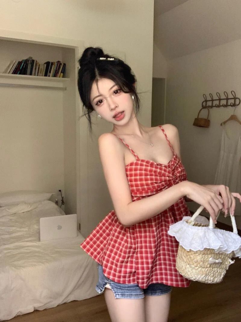 Gidyq-女性のための甘い市松模様のスパゲッティストラップタンク、韓国のファッション、セクシーな弓、ノースリーブ、ハラジュクストリートウェア、ショートトップ、夏、新しい_120