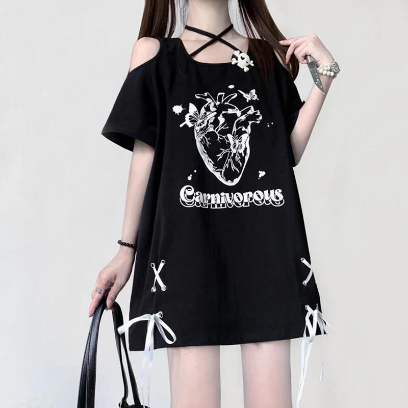 Gidyq-女性用オフショルダーレースアップTシャツ、アメリカのエレガントなレタープリント、半袖トップス、レトロファッション、カジュアルルーズシャツ_131