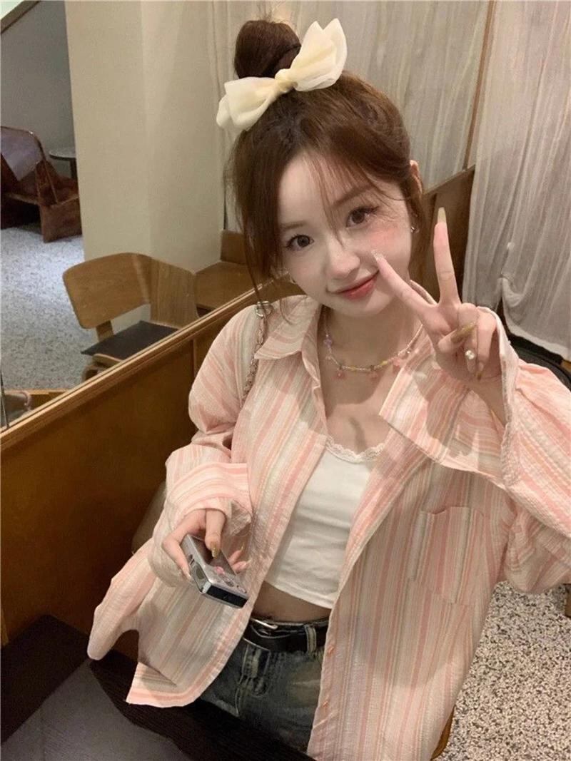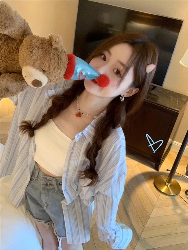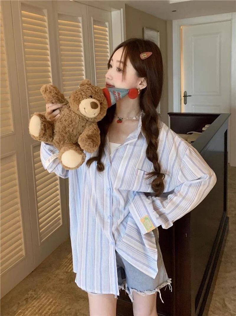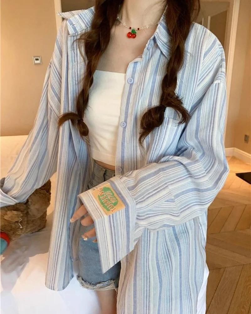 Gidyq-ストライプの女性用シャツ,折り返し襟,韓国のカジュアルトップ,十分な,薄いコート,女性の日焼け止めシャツ,夏のファッション_134
