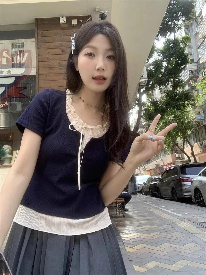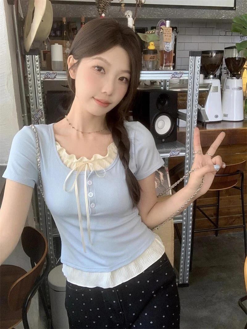 女性用原宿パッチワークスリムトップ,レースアップ,すべてのTシャツ,シックな韓国ファッション,ハイストリートサマー、ホット、ソフト、レディース、新作_154