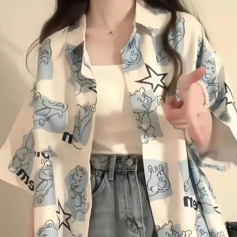 女性の漫画のカジュアルシャツ,韓国のファッション,y2kプレッピースタイル,女性のトップス,原宿ストリートウェア,ルーズでマッチするカワイイブラウス,夏_185