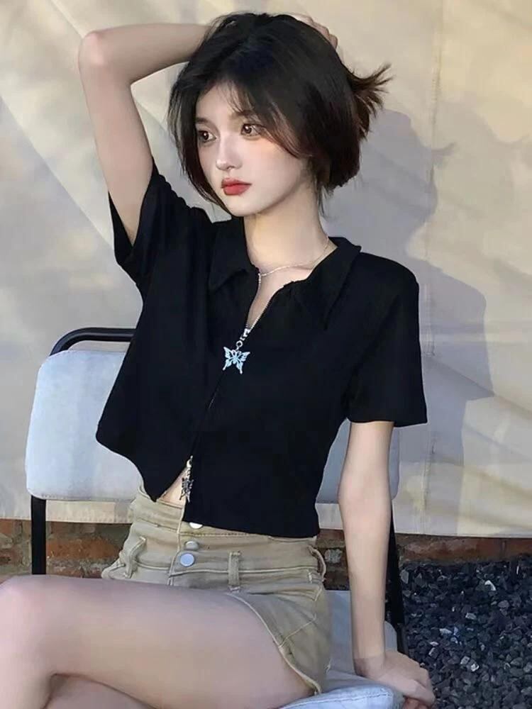 女性用ダブルジッパー付き半袖Tシャツ,スリム,韓国スタイル,y2k,黒,弓付き,ファッション,夏_195