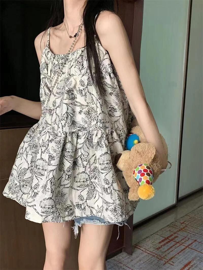 スパゲッティストラップ付きレディースカワイイキャミソール、バックレス、ノースリーブ、フローラルトップス、韓国、カジュアル、オフィス、レディース、サマーファッション、y2k_202