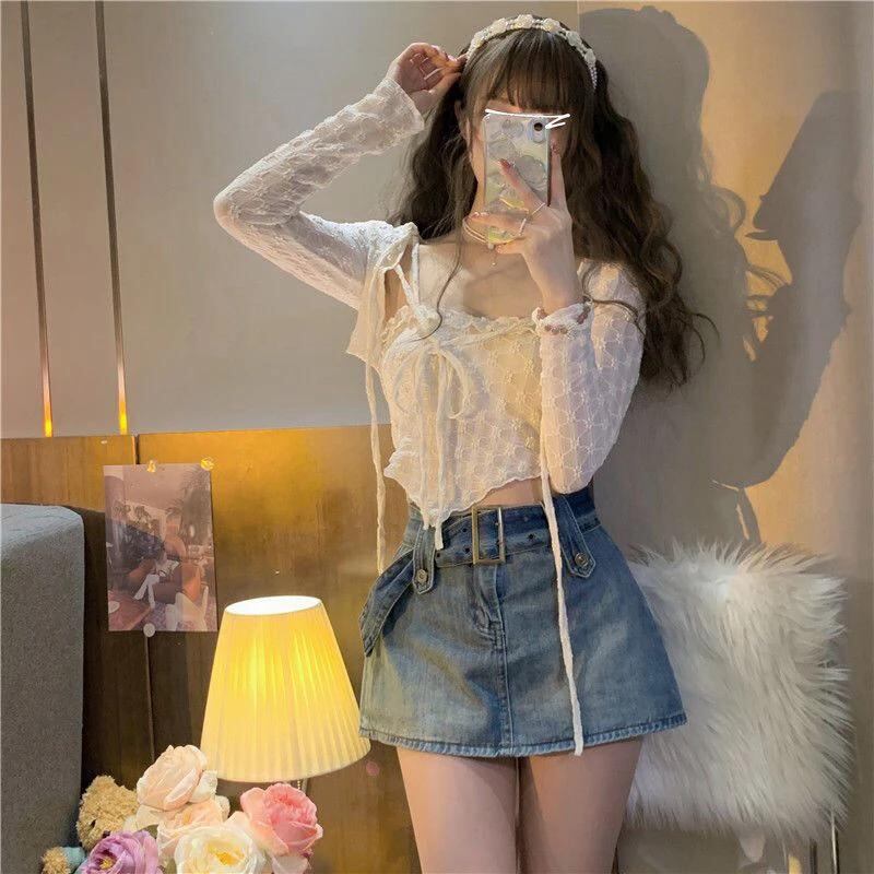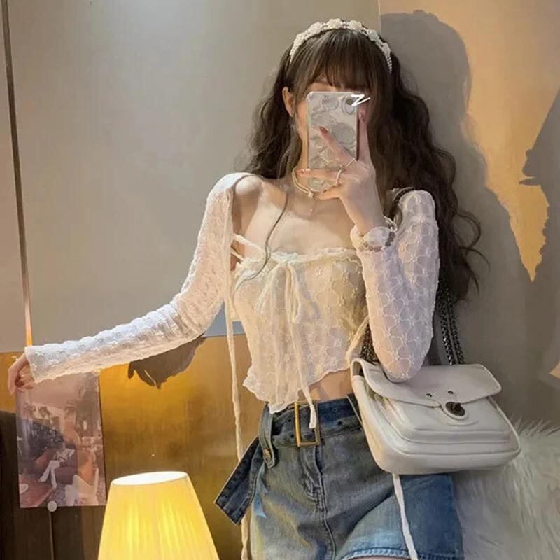 女性の不規則なレースのトップス,長袖カーディガン,キャミ,タンク,スリムフィット,すべてにマッチ,セクシーなストリートウェア,2ピースのトップス,新しいコレクション_206
