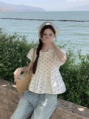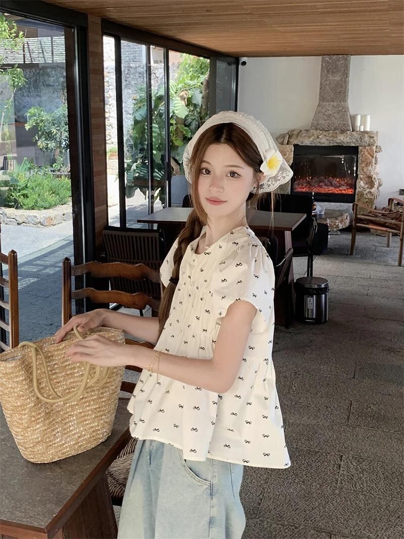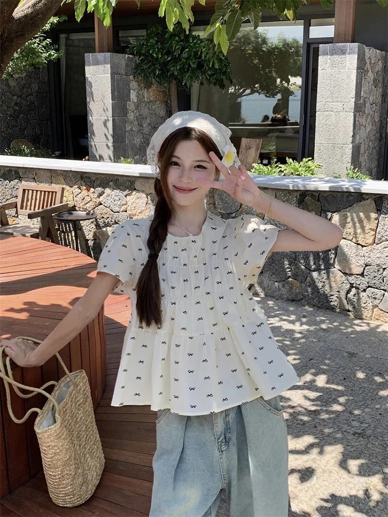 女性用フローラルプリーツトップス,半袖コットンTシャツ,パフスリーブ韓国シックでカジュアルなトップス,サマーファッション,新作コレクション_222