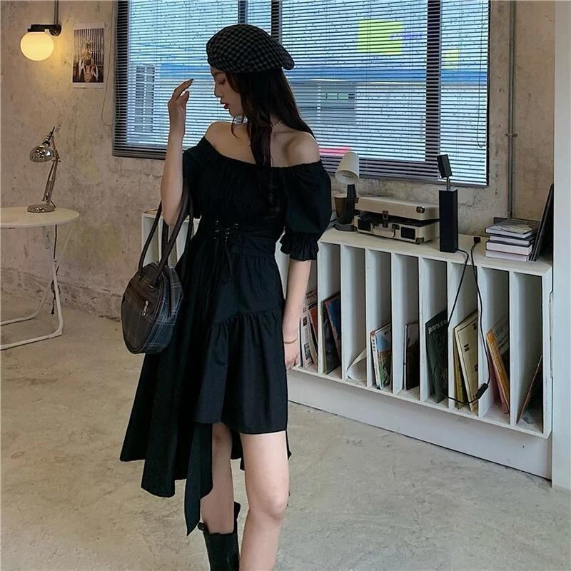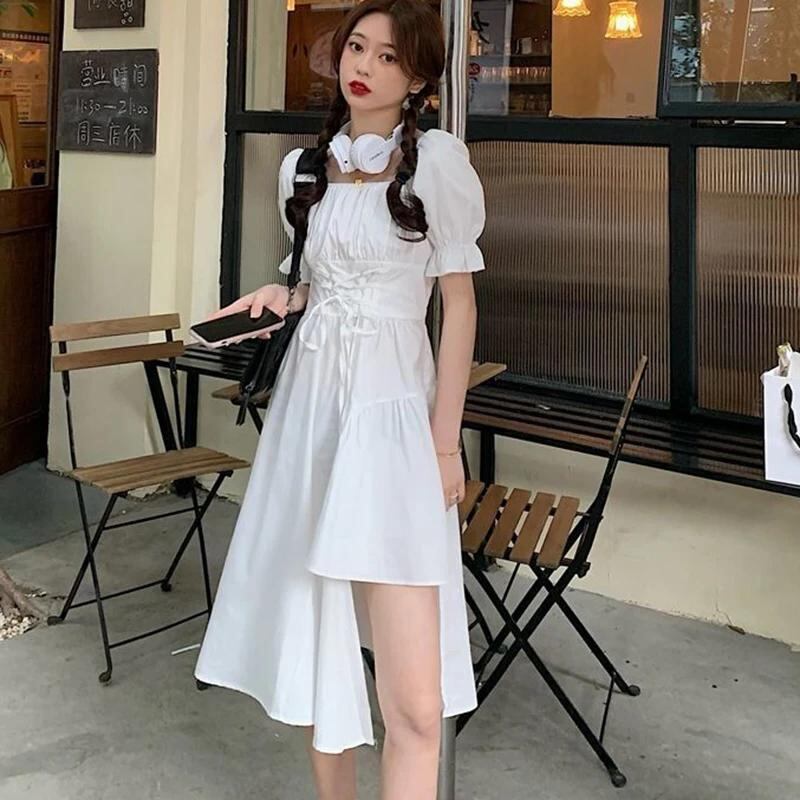女性の不規則なパフスリーブ,レースアップのドレス,プレッピースタイル,シック,韓国語,原宿,ハイウエスト,夏のファッション_231
