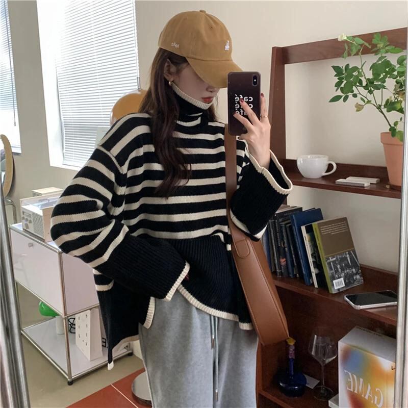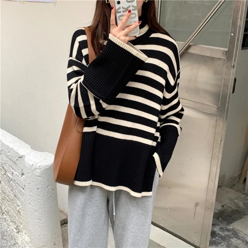 Gidyq-レディーススリットセーター,ルーズフィット,長袖,カジュアル,ストリートウェア,韓国のファッション,ストライプ,秋_234
