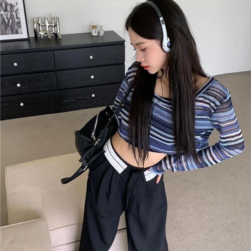 Godyq-女性用長袖Tシャツ,セクシー,ストライプ,透かし彫り,ストリートウェア,すべてにマッチ,新しい夏のコレクション_258