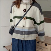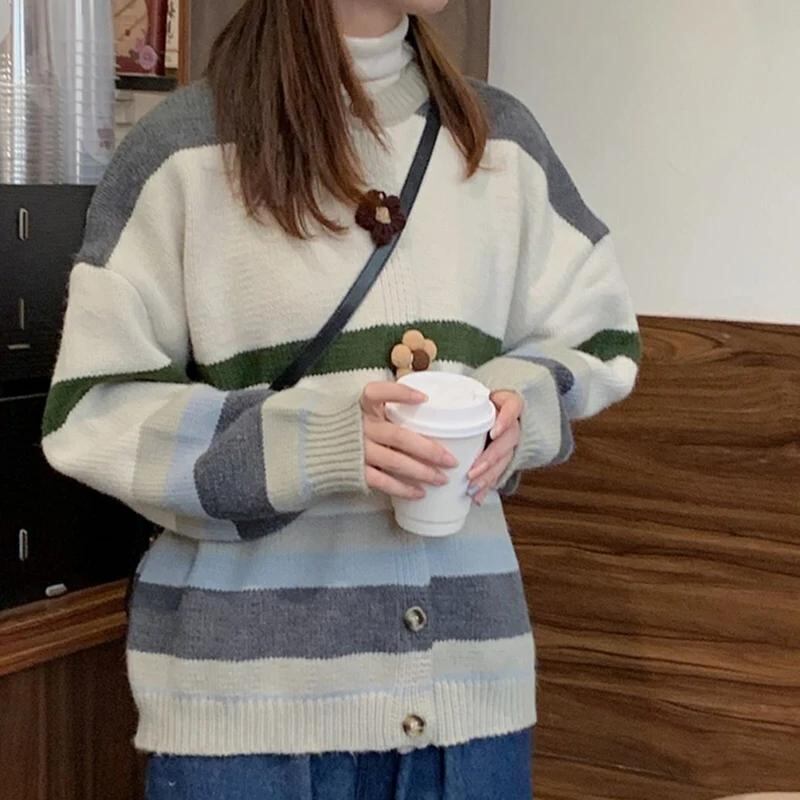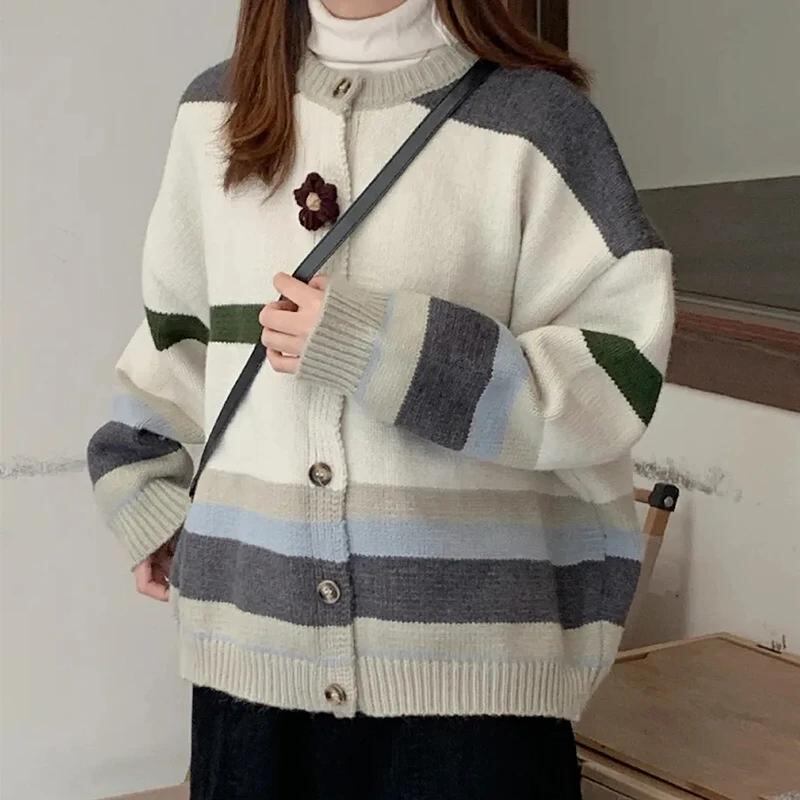 Gidyq-女性用ニットルーズカーディガンセーター、フラワーボタン、ストライプ、韓国ファッション、カジュアルコート、女性用ジャケット、秋、新品_274