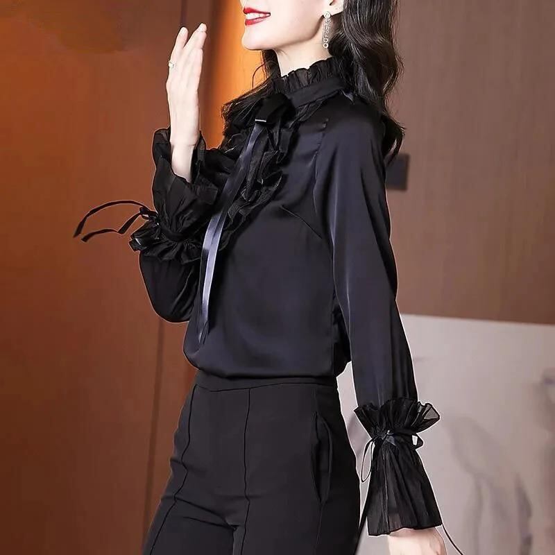 Gidyq-女性の韓国の弓のシャツ、エレガントな女性のシックな長袖ブラウス、春のファッション、すべての一致するパッチワークレースアップシャツ、新しい_275