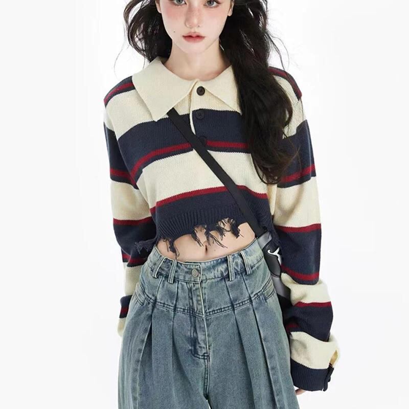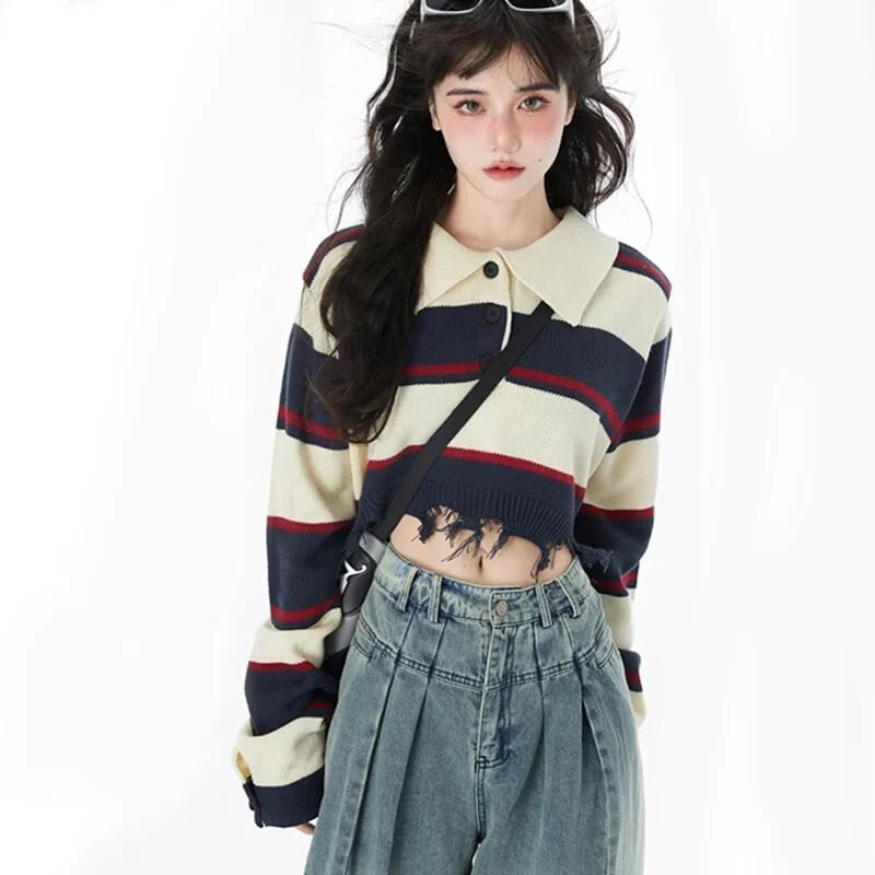 Gidyq-女性用ニット長袖セーター、ルーズストライププルオーバー、カジュアルレディースストリートウェア、タッセルジャンパー、韓国ファッション、秋、新品_302