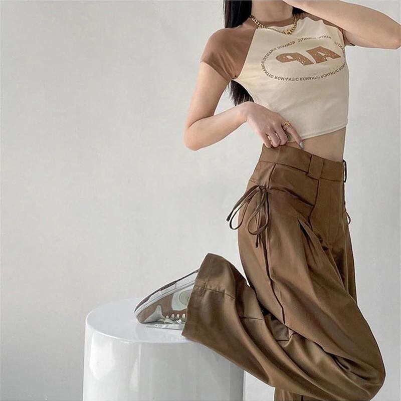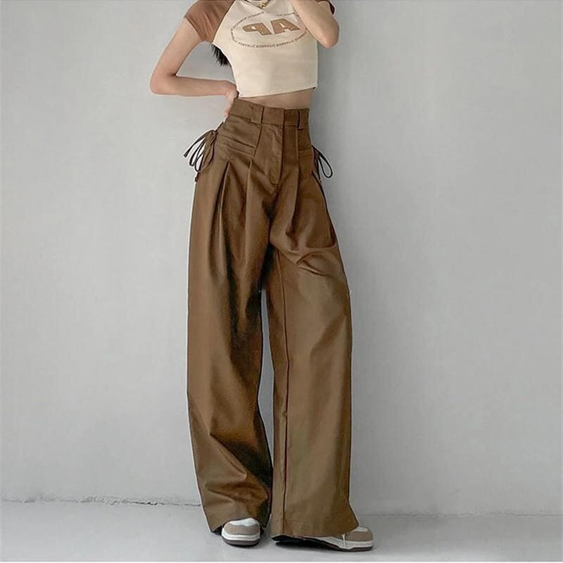 Gidyq-レディースワイドレッグパンツ、韓国ファッション、プリーツ、レースアップ、ルーズ、ハイウエスト、レディースカジュアルストレートパンツ、ストリートウェア、新_325